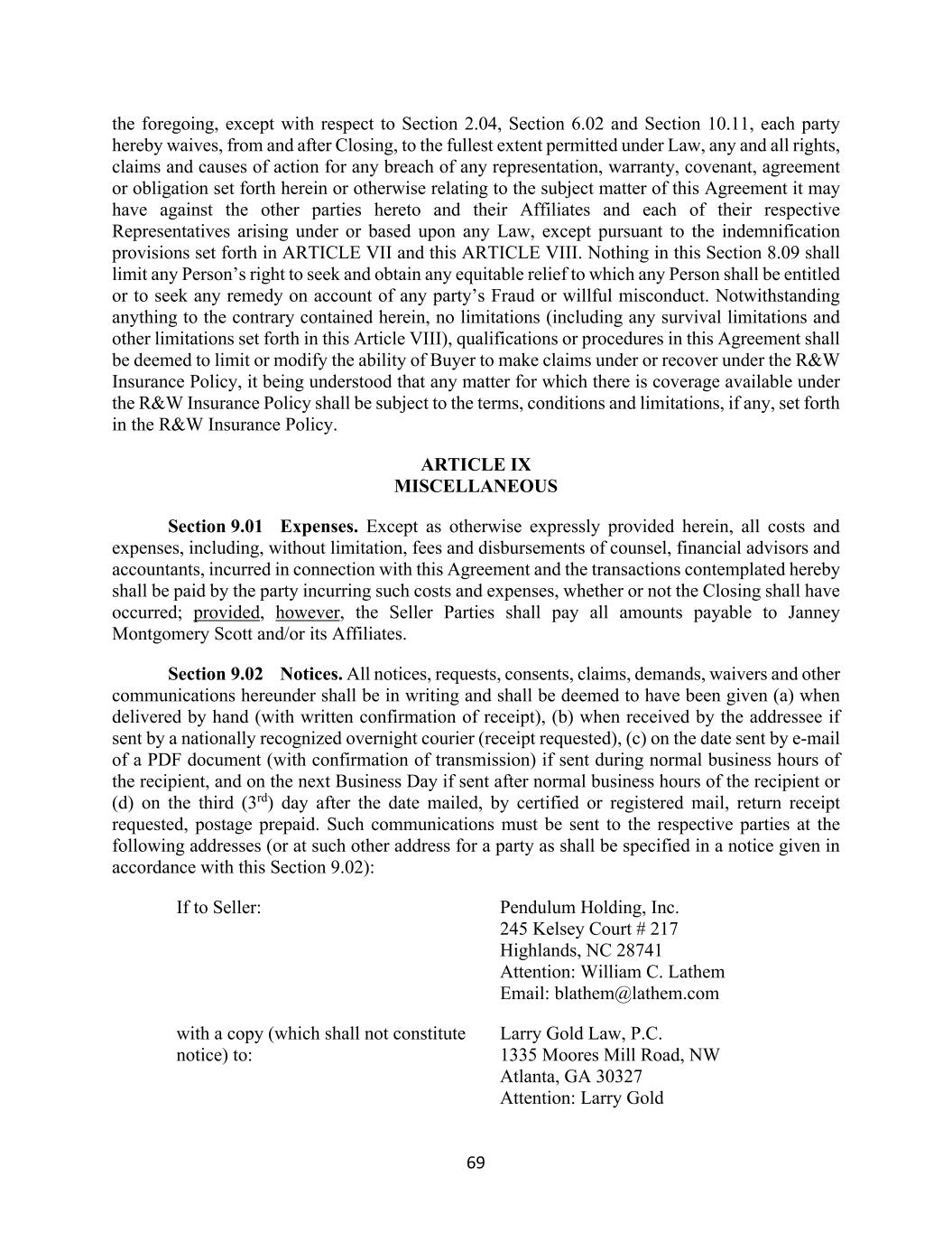 69 the foregoing, except with respect to Section 2.04, Section 6.02 and Section 10.11, each party hereby waives, from and after Closing, to the fullest extent permitted under Law, any and all rights, claims and causes of action for any breach of any representation, warranty, covenant, agreement or obligation set forth herein or otherwise relating to the subject matter of this Agreement it may have against the other parties hereto and their Affiliates and each of their respective Representatives arising under or based upon any Law, except pursuant to the indemnification provisions set forth in ARTICLE VII and this ARTICLE VIII. Nothing in this Section 8.09 shall limit any Person’s right to seek and obtain any equitable relief to which any Person shall be entitled or to seek any remedy on account of any party’s Fraud or willful misconduct. Notwithstanding anything to the contrary contained herein, no limitations (including any survival limitations and other limitations set forth in this Article VIII), qualifications or procedures in this Agreement shall be deemed to limit or modify the ability of Buyer to make claims under or recover under the R&W Insurance Policy, it being understood that any matter for which there is coverage available under the R&W Insurance Policy shall be subject to the terms, conditions and limitations, if any, set forth in the R&W Insurance Policy. ARTICLE IX MISCELLANEOUS Section 9.01 Expenses. Except as otherwise expressly provided herein, all costs and expenses, including, without limitation, fees and disbursements of counsel, financial advisors and accountants, incurred in connection with this Agreement and the transactions contemplated hereby shall be paid by the party incurring such costs and expenses, whether or not the Closing shall have occurred; provided, however, the Seller Parties shall pay all amounts payable to Janney Montgomery Scott and/or its Affiliates. Section 9.02 Notices. All notices, requests, consents, claims, demands, waivers and other communications hereunder shall be in writing and shall be deemed to have been given (a) when delivered by hand (with written confirmation of receipt), (b) when received by the addressee if sent by a nationally recognized overnight courier (receipt requested), (c) on the date sent by e-mail of a PDF document (with confirmation of transmission) if sent during normal business hours of the recipient, and on the next Business Day if sent after normal business hours of the recipient or (d) on the third (3rd) day after the date mailed, by certified or registered mail, return receipt requested, postage prepaid. Such communications must be sent to the respective parties at the following addresses (or at such other address for a party as shall be specified in a notice given in accordance with this Section 9.02): If to Seller: Pendulum Holding, Inc. 245 Kelsey Court # 217 Highlands, NC 28741 Attention: William C. Lathem Email: blathem@lathem.com with a copy (which shall not constitute notice) to: Larry Gold Law, P.C. 1335 Moores Mill Road, NW Atlanta, GA 30327 Attention: Larry Gold