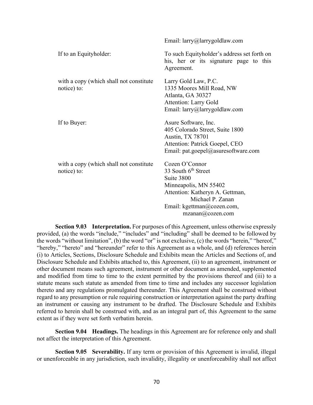 70 Email: larry@larrygoldlaw.com If to an Equityholder: To such Equityholder’s address set forth on his, her or its signature page to this Agreement. with a copy (which shall not constitute notice) to: Larry Gold Law, P.C. 1335 Moores Mill Road, NW Atlanta, GA 30327 Attention: Larry Gold Email: larry@larrygoldlaw.com If to Buyer: Asure Software, Inc. 405 Colorado Street, Suite 1800 Austin, TX 78701 Attention: Patrick Goepel, CEO Email: pat.goepel@asuresoftware.com with a copy (which shall not constitute notice) to: Cozen O’Connor 33 South 6th Street Suite 3800 Minneapolis, MN 55402 Attention: Katheryn A. Gettman, Michael P. Zanan Email: kgettman@cozen.com, mzanan@cozen.com Section 9.03 Interpretation. For purposes of this Agreement, unless otherwise expressly provided, (a) the words “include,” “includes” and “including” shall be deemed to be followed by the words “without limitation”, (b) the word “or” is not exclusive, (c) the words “herein,” “hereof,” “hereby,” “hereto” and “hereunder” refer to this Agreement as a whole, and (d) references herein (i) to Articles, Sections, Disclosure Schedule and Exhibits mean the Articles and Sections of, and Disclosure Schedule and Exhibits attached to, this Agreement, (ii) to an agreement, instrument or other document means such agreement, instrument or other document as amended, supplemented and modified from time to time to the extent permitted by the provisions thereof and (iii) to a statute means such statute as amended from time to time and includes any successor legislation thereto and any regulations promulgated thereunder. This Agreement shall be construed without regard to any presumption or rule requiring construction or interpretation against the party drafting an instrument or causing any instrument to be drafted. The Disclosure Schedule and Exhibits referred to herein shall be construed with, and as an integral part of, this Agreement to the same extent as if they were set forth verbatim herein. Section 9.04 Headings. The headings in this Agreement are for reference only and shall not affect the interpretation of this Agreement. Section 9.05 Severability. If any term or provision of this Agreement is invalid, illegal or unenforceable in any jurisdiction, such invalidity, illegality or unenforceability shall not affect