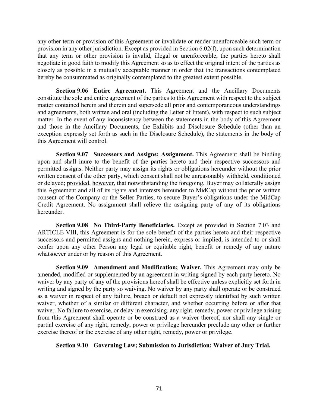 71 any other term or provision of this Agreement or invalidate or render unenforceable such term or provision in any other jurisdiction. Except as provided in Section 6.02(f), upon such determination that any term or other provision is invalid, illegal or unenforceable, the parties hereto shall negotiate in good faith to modify this Agreement so as to effect the original intent of the parties as closely as possible in a mutually acceptable manner in order that the transactions contemplated hereby be consummated as originally contemplated to the greatest extent possible. Section 9.06 Entire Agreement. This Agreement and the Ancillary Documents constitute the sole and entire agreement of the parties to this Agreement with respect to the subject matter contained herein and therein and supersede all prior and contemporaneous understandings and agreements, both written and oral (including the Letter of Intent), with respect to such subject matter. In the event of any inconsistency between the statements in the body of this Agreement and those in the Ancillary Documents, the Exhibits and Disclosure Schedule (other than an exception expressly set forth as such in the Disclosure Schedule), the statements in the body of this Agreement will control. Section 9.07 Successors and Assigns; Assignment. This Agreement shall be binding upon and shall inure to the benefit of the parties hereto and their respective successors and permitted assigns. Neither party may assign its rights or obligations hereunder without the prior written consent of the other party, which consent shall not be unreasonably withheld, conditioned or delayed; provided, however, that notwithstanding the foregoing, Buyer may collaterally assign this Agreement and all of its rights and interests hereunder to MidCap without the prior written consent of the Company or the Seller Parties, to secure Buyer’s obligations under the MidCap Credit Agreement. No assignment shall relieve the assigning party of any of its obligations hereunder. Section 9.08 No Third-Party Beneficiaries. Except as provided in Section 7.03 and ARTICLE VIII, this Agreement is for the sole benefit of the parties hereto and their respective successors and permitted assigns and nothing herein, express or implied, is intended to or shall confer upon any other Person any legal or equitable right, benefit or remedy of any nature whatsoever under or by reason of this Agreement. Section 9.09 Amendment and Modification; Waiver. This Agreement may only be amended, modified or supplemented by an agreement in writing signed by each party hereto. No waiver by any party of any of the provisions hereof shall be effective unless explicitly set forth in writing and signed by the party so waiving. No waiver by any party shall operate or be construed as a waiver in respect of any failure, breach or default not expressly identified by such written waiver, whether of a similar or different character, and whether occurring before or after that waiver. No failure to exercise, or delay in exercising, any right, remedy, power or privilege arising from this Agreement shall operate or be construed as a waiver thereof, nor shall any single or partial exercise of any right, remedy, power or privilege hereunder preclude any other or further exercise thereof or the exercise of any other right, remedy, power or privilege. Section 9.10 Governing Law; Submission to Jurisdiction; Waiver of Jury Trial.