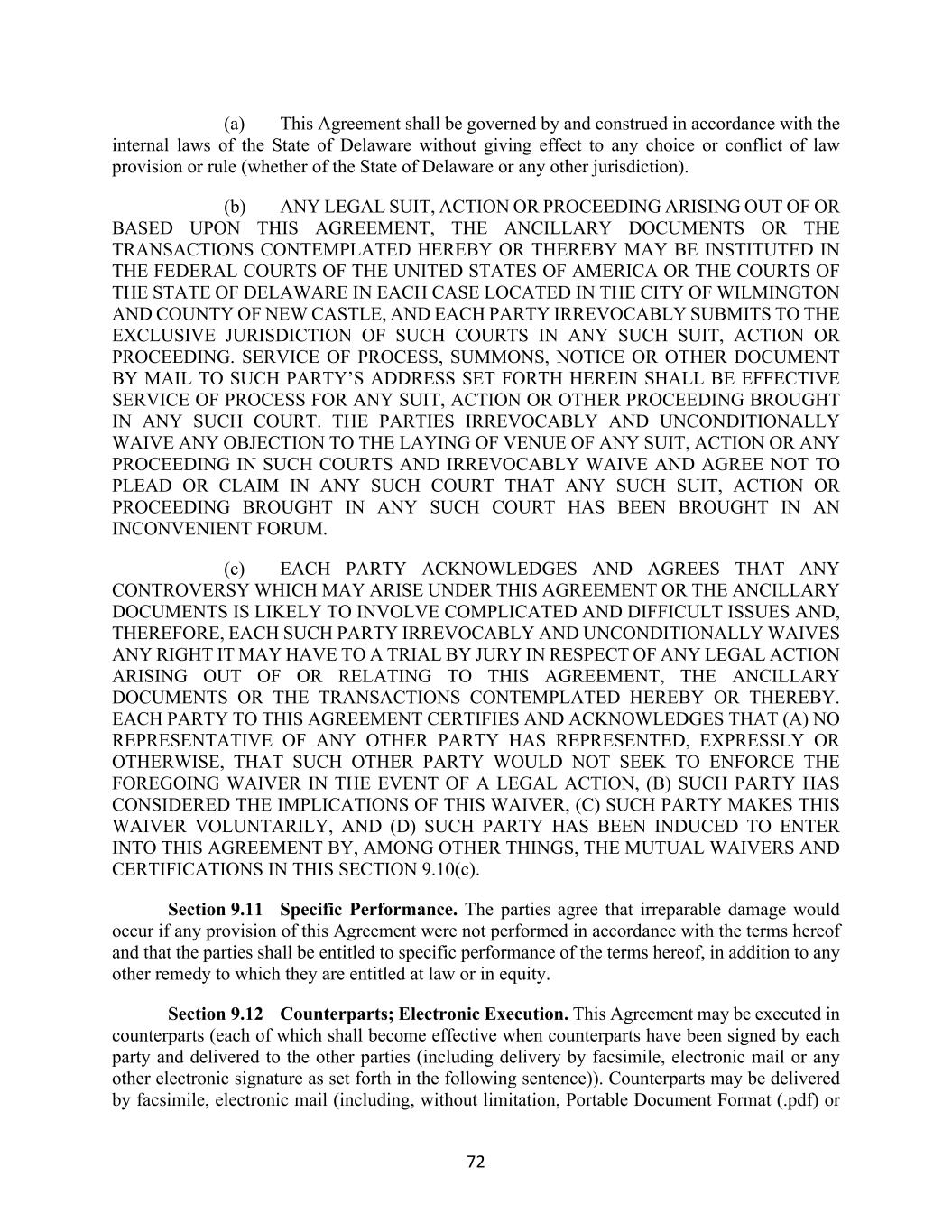 72 (a) This Agreement shall be governed by and construed in accordance with the internal laws of the State of Delaware without giving effect to any choice or conflict of law provision or rule (whether of the State of Delaware or any other jurisdiction). (b) ANY LEGAL SUIT, ACTION OR PROCEEDING ARISING OUT OF OR BASED UPON THIS AGREEMENT, THE ANCILLARY DOCUMENTS OR THE TRANSACTIONS CONTEMPLATED HEREBY OR THEREBY MAY BE INSTITUTED IN THE FEDERAL COURTS OF THE UNITED STATES OF AMERICA OR THE COURTS OF THE STATE OF DELAWARE IN EACH CASE LOCATED IN THE CITY OF WILMINGTON AND COUNTY OF NEW CASTLE, AND EACH PARTY IRREVOCABLY SUBMITS TO THE EXCLUSIVE JURISDICTION OF SUCH COURTS IN ANY SUCH SUIT, ACTION OR PROCEEDING. SERVICE OF PROCESS, SUMMONS, NOTICE OR OTHER DOCUMENT BY MAIL TO SUCH PARTY’S ADDRESS SET FORTH HEREIN SHALL BE EFFECTIVE SERVICE OF PROCESS FOR ANY SUIT, ACTION OR OTHER PROCEEDING BROUGHT IN ANY SUCH COURT. THE PARTIES IRREVOCABLY AND UNCONDITIONALLY WAIVE ANY OBJECTION TO THE LAYING OF VENUE OF ANY SUIT, ACTION OR ANY PROCEEDING IN SUCH COURTS AND IRREVOCABLY WAIVE AND AGREE NOT TO PLEAD OR CLAIM IN ANY SUCH COURT THAT ANY SUCH SUIT, ACTION OR PROCEEDING BROUGHT IN ANY SUCH COURT HAS BEEN BROUGHT IN AN INCONVENIENT FORUM. (c) EACH PARTY ACKNOWLEDGES AND AGREES THAT ANY CONTROVERSY WHICH MAY ARISE UNDER THIS AGREEMENT OR THE ANCILLARY DOCUMENTS IS LIKELY TO INVOLVE COMPLICATED AND DIFFICULT ISSUES AND, THEREFORE, EACH SUCH PARTY IRREVOCABLY AND UNCONDITIONALLY WAIVES ANY RIGHT IT MAY HAVE TO A TRIAL BY JURY IN RESPECT OF ANY LEGAL ACTION ARISING OUT OF OR RELATING TO THIS AGREEMENT, THE ANCILLARY DOCUMENTS OR THE TRANSACTIONS CONTEMPLATED HEREBY OR THEREBY. EACH PARTY TO THIS AGREEMENT CERTIFIES AND ACKNOWLEDGES THAT (A) NO REPRESENTATIVE OF ANY OTHER PARTY HAS REPRESENTED, EXPRESSLY OR OTHERWISE, THAT SUCH OTHER PARTY WOULD NOT SEEK TO ENFORCE THE FOREGOING WAIVER IN THE EVENT OF A LEGAL ACTION, (B) SUCH PARTY HAS CONSIDERED THE IMPLICATIONS OF THIS WAIVER, (C) SUCH PARTY MAKES THIS WAIVER VOLUNTARILY, AND (D) SUCH PARTY HAS BEEN INDUCED TO ENTER INTO THIS AGREEMENT BY, AMONG OTHER THINGS, THE MUTUAL WAIVERS AND CERTIFICATIONS IN THIS SECTION 9.10(c). Section 9.11 Specific Performance. The parties agree that irreparable damage would occur if any provision of this Agreement were not performed in accordance with the terms hereof and that the parties shall be entitled to specific performance of the terms hereof, in addition to any other remedy to which they are entitled at law or in equity. Section 9.12 Counterparts; Electronic Execution. This Agreement may be executed in counterparts (each of which shall become effective when counterparts have been signed by each party and delivered to the other parties (including delivery by facsimile, electronic mail or any other electronic signature as set forth in the following sentence)). Counterparts may be delivered by facsimile, electronic mail (including, without limitation, Portable Document Format (.pdf) or