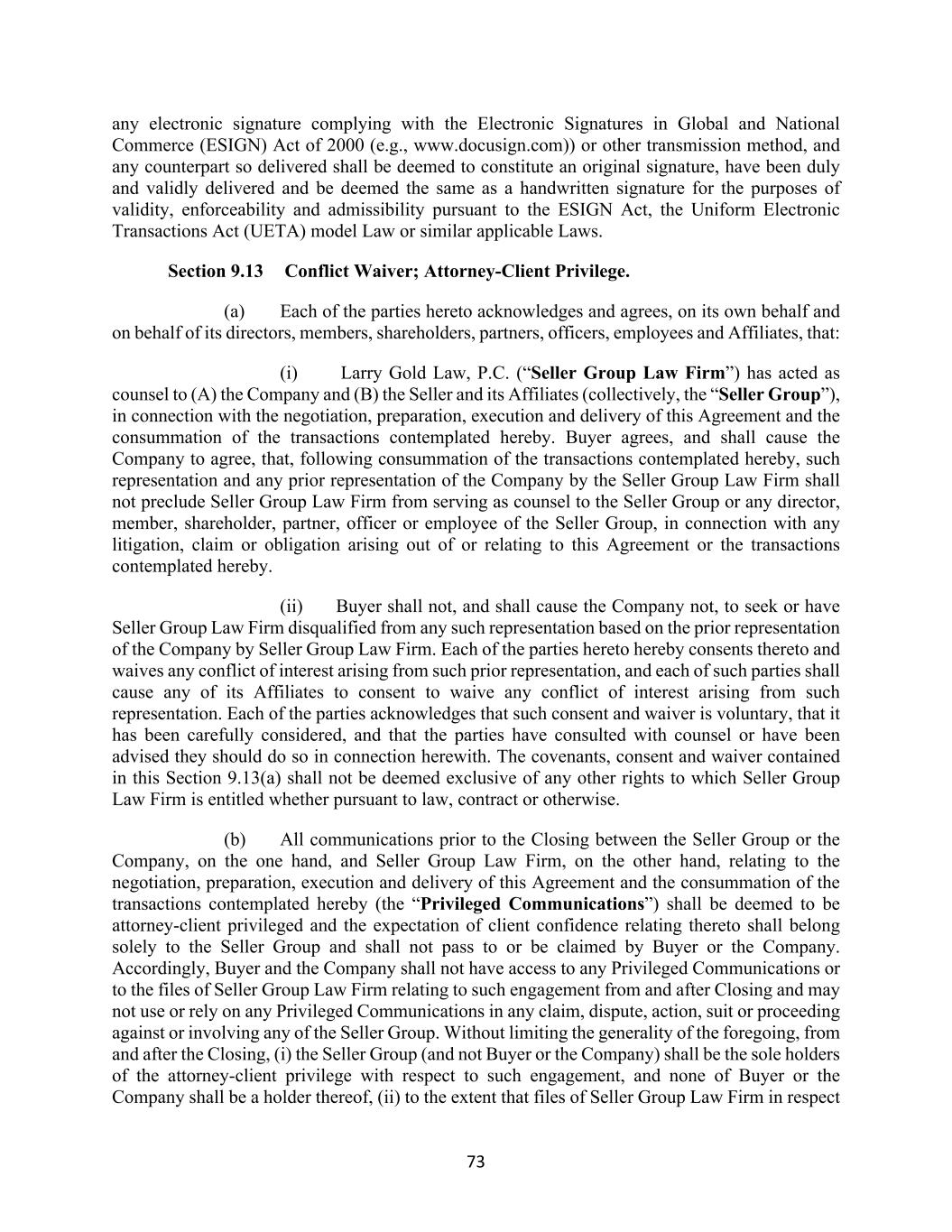 73 any electronic signature complying with the Electronic Signatures in Global and National Commerce (ESIGN) Act of 2000 (e.g., www.docusign.com)) or other transmission method, and any counterpart so delivered shall be deemed to constitute an original signature, have been duly and validly delivered and be deemed the same as a handwritten signature for the purposes of validity, enforceability and admissibility pursuant to the ESIGN Act, the Uniform Electronic Transactions Act (UETA) model Law or similar applicable Laws. Section 9.13 Conflict Waiver; Attorney-Client Privilege. (a) Each of the parties hereto acknowledges and agrees, on its own behalf and on behalf of its directors, members, shareholders, partners, officers, employees and Affiliates, that: (i) Larry Gold Law, P.C. (“Seller Group Law Firm”) has acted as counsel to (A) the Company and (B) the Seller and its Affiliates (collectively, the “Seller Group”), in connection with the negotiation, preparation, execution and delivery of this Agreement and the consummation of the transactions contemplated hereby. Buyer agrees, and shall cause the Company to agree, that, following consummation of the transactions contemplated hereby, such representation and any prior representation of the Company by the Seller Group Law Firm shall not preclude Seller Group Law Firm from serving as counsel to the Seller Group or any director, member, shareholder, partner, officer or employee of the Seller Group, in connection with any litigation, claim or obligation arising out of or relating to this Agreement or the transactions contemplated hereby. (ii) Buyer shall not, and shall cause the Company not, to seek or have Seller Group Law Firm disqualified from any such representation based on the prior representation of the Company by Seller Group Law Firm. Each of the parties hereto hereby consents thereto and waives any conflict of interest arising from such prior representation, and each of such parties shall cause any of its Affiliates to consent to waive any conflict of interest arising from such representation. Each of the parties acknowledges that such consent and waiver is voluntary, that it has been carefully considered, and that the parties have consulted with counsel or have been advised they should do so in connection herewith. The covenants, consent and waiver contained in this Section 9.13(a) shall not be deemed exclusive of any other rights to which Seller Group Law Firm is entitled whether pursuant to law, contract or otherwise. (b) All communications prior to the Closing between the Seller Group or the Company, on the one hand, and Seller Group Law Firm, on the other hand, relating to the negotiation, preparation, execution and delivery of this Agreement and the consummation of the transactions contemplated hereby (the “Privileged Communications”) shall be deemed to be attorney-client privileged and the expectation of client confidence relating thereto shall belong solely to the Seller Group and shall not pass to or be claimed by Buyer or the Company. Accordingly, Buyer and the Company shall not have access to any Privileged Communications or to the files of Seller Group Law Firm relating to such engagement from and after Closing and may not use or rely on any Privileged Communications in any claim, dispute, action, suit or proceeding against or involving any of the Seller Group. Without limiting the generality of the foregoing, from and after the Closing, (i) the Seller Group (and not Buyer or the Company) shall be the sole holders of the attorney-client privilege with respect to such engagement, and none of Buyer or the Company shall be a holder thereof, (ii) to the extent that files of Seller Group Law Firm in respect