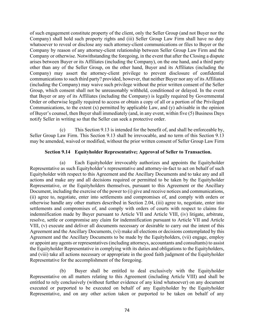 74 of such engagement constitute property of the client, only the Seller Group (and not Buyer nor the Company) shall hold such property rights and (iii) Seller Group Law Firm shall have no duty whatsoever to reveal or disclose any such attorney-client communications or files to Buyer or the Company by reason of any attorney-client relationship between Seller Group Law Firm and the Company or otherwise. Notwithstanding the foregoing, in the event that after the Closing a dispute arises between Buyer or its Affiliates (including the Company), on the one hand, and a third party other than any of the Seller Group, on the other hand, Buyer and its Affiliates (including the Company) may assert the attorney-client privilege to prevent disclosure of confidential communications to such third party? provided, however, that neither Buyer nor any of its Affiliates (including the Company) may waive such privilege without the prior written consent of the Seller Group, which consent shall not be unreasonably withheld, conditioned or delayed. In the event that Buyer or any of its Affiliates (including the Company) is legally required by Governmental Order or otherwise legally required to access or obtain a copy of all or a portion of the Privileged Communications, to the extent (x) permitted by applicable Law, and (y) advisable in the opinion of Buyer’s counsel, then Buyer shall immediately (and, in any event, within five (5) Business Days notify Seller in writing so that the Seller can seek a protective order. (c) This Section 9.13 is intended for the benefit of, and shall be enforceable by, Seller Group Law Firm. This Section 9.13 shall be irrevocable, and no term of this Section 9.13 may be amended, waived or modified, without the prior written consent of Seller Group Law Firm Section 9.14 Equityholder Representative; Approval of Seller to Transaction. (a) Each Equityholder irrevocably authorizes and appoints the Equityholder Representative as such Equityholder’s representative and attorney-in-fact to act on behalf of such Equityholder with respect to this Agreement and the Ancillary Documents and to take any and all actions and make any and all decisions required or permitted to be taken by the Equityholder Representative, or the Equityholders themselves, pursuant to this Agreement or the Ancillary Document, including the exercise of the power to (i) give and receive notices and communications, (ii) agree to, negotiate, enter into settlements and compromises of, and comply with orders or otherwise handle any other matters described in Section 2.04, (iii) agree to, negotiate, enter into settlements and compromises of, and comply with orders of courts with respect to claims for indemnification made by Buyer pursuant to Article VII and Article VIII, (iv) litigate, arbitrate, resolve, settle or compromise any claim for indemnification pursuant to Article VII and Article VIII, (v) execute and deliver all documents necessary or desirable to carry out the intent of this Agreement and the Ancillary Documents, (vi) make all elections or decisions contemplated by this Agreement and the Ancillary Documents to be made by the Equityholders, (vii) engage, employ or appoint any agents or representatives (including attorneys, accountants and consultants) to assist the Equityholder Representative in complying with its duties and obligations to the Equityholders, and (viii) take all actions necessary or appropriate in the good faith judgment of the Equityholder Representative for the accomplishment of the foregoing. (b) Buyer shall be entitled to deal exclusively with the Equityholder Representative on all matters relating to this Agreement (including Article VIII) and shall be entitled to rely conclusively (without further evidence of any kind whatsoever) on any document executed or purported to be executed on behalf of any Equityholder by the Equityholder Representative, and on any other action taken or purported to be taken on behalf of any