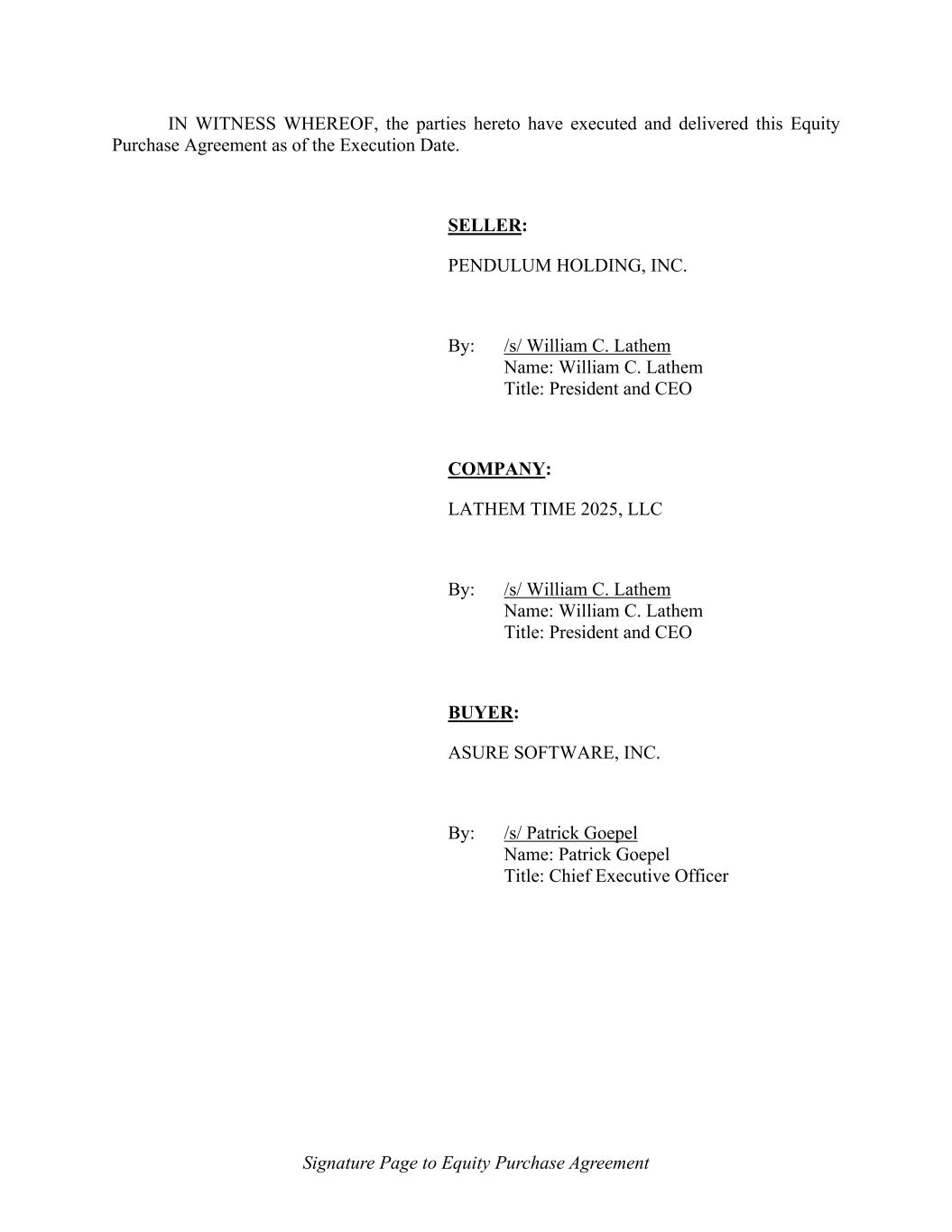 Signature Page to Equity Purchase Agreement IN WITNESS WHEREOF, the parties hereto have executed and delivered this Equity Purchase Agreement as of the Execution Date. SELLER: PENDULUM HOLDING, INC. By: /s/ William C. Lathem Name: William C. Lathem Title: President and CEO COMPANY: LATHEM TIME 2025, LLC By: /s/ William C. Lathem Name: William C. Lathem Title: President and CEO BUYER: ASURE SOFTWARE, INC. By: /s/ Patrick Goepel Name: Patrick Goepel Title: Chief Executive Officer