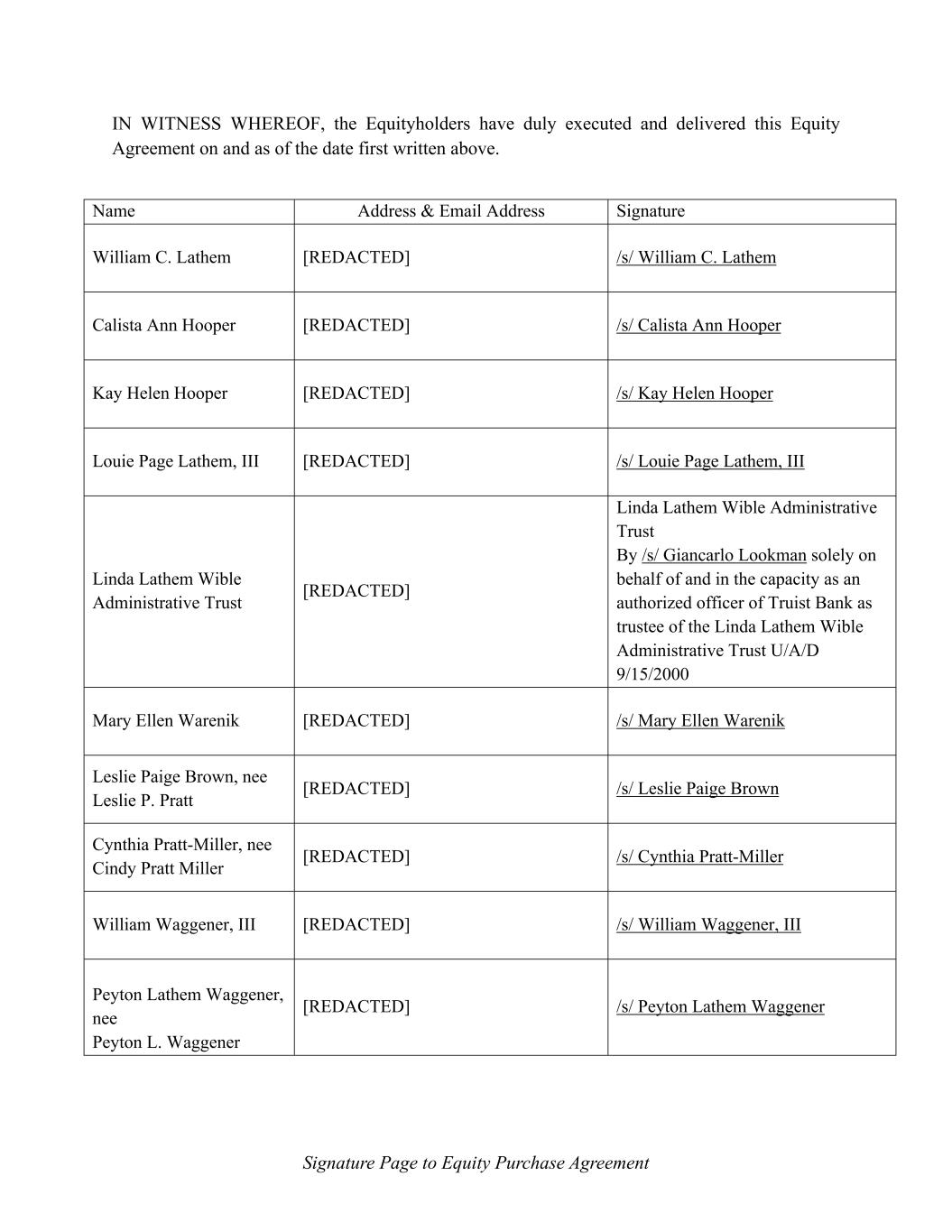 Signature Page to Equity Purchase Agreement IN WITNESS WHEREOF, the Equityholders have duly executed and delivered this Equity Agreement on and as of the date first written above. Name Address & Email Address Signature William C. Lathem [REDACTED] /s/ William C. Lathem Calista Ann Hooper [REDACTED] /s/ Calista Ann Hooper Kay Helen Hooper [REDACTED] /s/ Kay Helen Hooper Louie Page Lathem, III [REDACTED] /s/ Louie Page Lathem, III Linda Lathem Wible Administrative Trust [REDACTED] Linda Lathem Wible Administrative Trust By /s/ Giancarlo Lookman solely on behalf of and in the capacity as an authorized officer of Truist Bank as trustee of the Linda Lathem Wible Administrative Trust U/A/D 9/15/2000 Mary Ellen Warenik [REDACTED] /s/ Mary Ellen Warenik Leslie Paige Brown, nee Leslie P. Pratt [REDACTED] /s/ Leslie Paige Brown Cynthia Pratt-Miller, nee Cindy Pratt Miller [REDACTED] /s/ Cynthia Pratt-Miller William Waggener, III [REDACTED] /s/ William Waggener, III Peyton Lathem Waggener, nee Peyton L. Waggener [REDACTED] /s/ Peyton Lathem Waggener