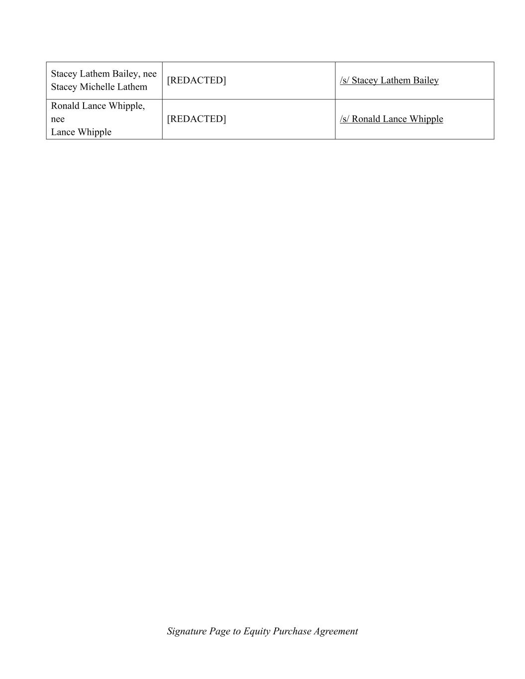 Signature Page to Equity Purchase Agreement Stacey Lathem Bailey, nee Stacey Michelle Lathem [REDACTED] /s/ Stacey Lathem Bailey Ronald Lance Whipple, nee Lance Whipple [REDACTED] /s/ Ronald Lance Whipple