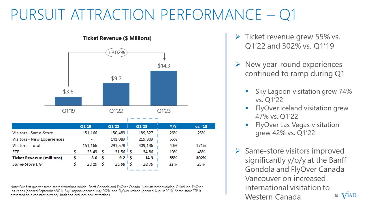 9  Pursuit delivered Record first quarter revenue  Q1’23 revenue of $32.7 million increased 37% year over year and 206% from Q1’19  $16.9 million was generated by new experiences acquired/opened from 2019 to present  As compared to Q1’19, we drove revenue growth of 48% from same-store experiences owned/open prior to 2019  Lower seasonal EBITDA loss vs. Q1’22 on improved revenue  Pursuit Revenue  (in millions)  New Experiences(1)  Same-Store(2)  (1) New Experiences that were opened or acquired after January 1, 2019, include:  Forest Park Hotel (opened August 2022)  Glacier Raft Co (acquired April 2022)  FlyOver Las Vegas (opened September 2021)  Sky Lagoon (opened May 2021)  Golden Skybridge (acquired March 2021 / opened June 2021)  Glacier Basecamp Lodge (acquired January 2020)  (2) Same-store excludes any experiences that were not owned or opened for the entirety of all years presented  Open Top Touring (opened September 2020)  FlyOver Iceland (opened August 2019)  West Glacier RV Park (opened July 2019)  Mountain Park Lodges (acquired June 2019)  Belton Chalet (acquired May 2019)  Adj. EBITDA* ($8.8) ($11.5) ($10.3)  Margin -82.3% -48.3% -31.6%