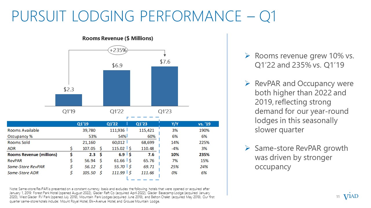 10  Pursuit attraction PERFORMANCE – Q1  Ticket revenue grew 55% vs. Q1’22 and 302% vs. Q1’19  New year-round experiences continued to ramp during Q1  Sky Lagoon visitation grew 74% vs. Q1’22  FlyOver Iceland visitation grew 47% vs. Q1’22  FlyOver Las Vegas visitation grew 42% vs. Q1’22  Same-store visitors improved significantly y/o/y at the Banff Gondola and FlyOver Canada Vancouver on increased international visitation to Western Canada  Note: Our first quarter same-store attractions include: Banff Gondola and FlyOver Canada. New attractions during Q1 include FlyOver Las Vegas (opened September 2021), Sky Lagoon (opened May 2021), and FlyOver Iceland (opened August 2019). Same-store ETP is presented on a constant currency basis and excludes new attractions.   Ticket Revenue ($ Millions)  Q1’23  Q1’19  Q1’22  +302%