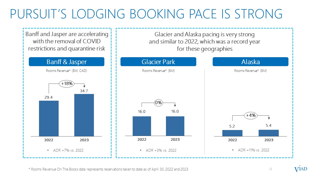 12  Banff & Jasper  ADR +3% vs. 2022  ADR +11% vs. 2022  ADR +7% vs. 2022  Rooms Revenue* ($M, CAD)   * Rooms Revenue On The Books data represents reservations taken to date as of April 30, 2022 and 2023   Glacier Park  Rooms Revenue* ($M)  Alaska  Rooms Revenue* ($M)  2022  2023  0%  2022  2023  +4%  2022  2023  +18%  Pursuit’s lodging booking pace is strong  Banff and Jasper are accelerating with the removal of COVID restrictions and quarantine risk  Glacier and Alaska pacing is very strong  and similar to 2022, which was a record year for these geographies