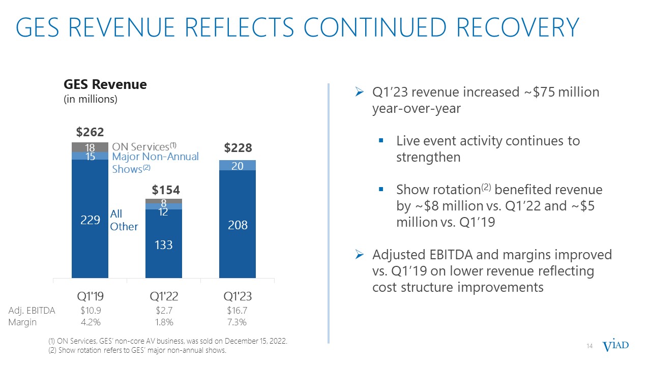 14  GES REVENUE reflects continued recovery  GES Revenue  (in millions)  Q1’23 revenue increased ~$75 million year-over-year  Live event activity continues to strengthen  Show rotation(2) benefited revenue by ~$8 million vs. Q1’22 and ~$5 million vs. Q1’19  Adjusted EBITDA and margins improved vs. Q1’19 on lower revenue reflecting cost structure improvements  Major Non-Annual Shows(2)  All Other  (1) ON Services, GES’ non-core AV business, was sold on December 15, 2022.  (2) Show rotation refers to GES’ major non-annual shows.   ON Services(1)  Adj. EBITDA $10.9 $2.7 $16.7  Margin 4.2% 1.8% 7.3%