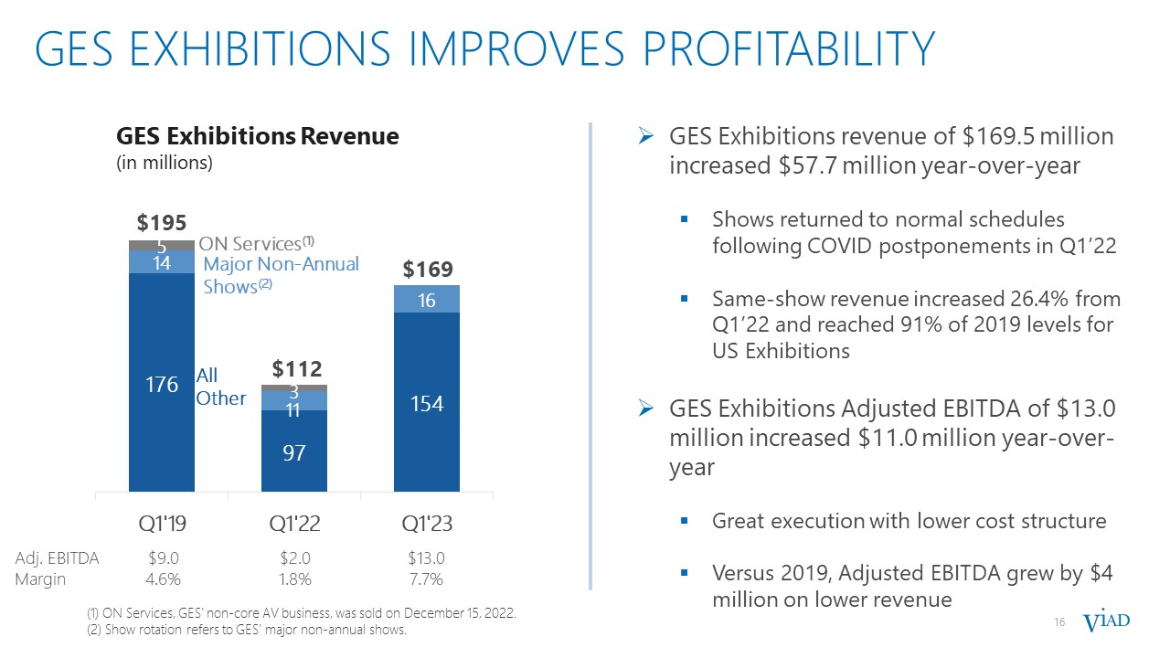15  SPIRO GROWS TOP LINE AT STRONG MARGIN  Spiro Revenue  (in millions)  Spiro revenue of $60.4 million increased $17.5 million year-over-year  Continuing to win new logos and cultivate existing clients from expanding capabilities   Clients’ marketing spending approaching 2019 levels  Won 7 new clients YTD  Spiro Adjusted EBITDA of $3.7 million increased $3.0 million year-over-year  All Other  ON Services(1)  (1) ON Services, GES’ non-core AV business, was sold on December 15, 2022.  (2) Show rotation refers to GES’ major non-annual shows.   Adj. EBITDA $1.9 $0.7 $3.7  Margin 2.9% 1.7% 6.2%  Major Non-Annual Shows(2)