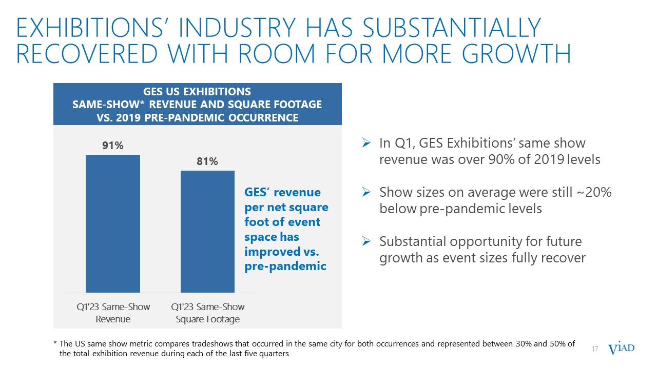 16  GES EXHIBITIONS improves PROFITABILITY  GES Exhibitions revenue of $169.5 million increased $57.7 million year-over-year  Shows returned to normal schedules following COVID postponements in Q1’22  Same-show revenue increased 26.4% from Q1’22 and reached 91% of 2019 levels for US Exhibitions  GES Exhibitions Adjusted EBITDA of $13.0 million increased $11.0 million year-over-year  Great execution with lower cost structure  Versus 2019, Adjusted EBITDA grew by $4 million on lower revenue  GES Exhibitions Revenue  (in millions)  All Other  ON Services(1)  (1) ON Services, GES’ non-core AV business, was sold on December 15, 2022.  (2) Show rotation refers to GES’ major non-annual shows.   Adj. EBITDA $9.0 $2.0 $13.0  Margin 4.6% 1.8% 7.7%  Major Non-Annual Shows(2)