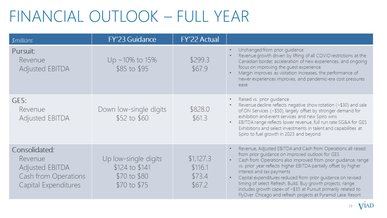 20  FINANCIAL OUTLOOK – Q2  20  $millions  Q2’23 Guidance  Q2’22 Actual  Pursuit:  Revenue  Adjusted EBITDA  $89 to $93  $19 to $22  $77.6  $15.6  Growth driven by lifting of all COVID restrictions at the Canadian border, acceleration of new experiences, and ongoing focus on improving the guest experience  GES:  Revenue  Adjusted EBITDA  $200 to $220  $20 to $24  $241.6  $35.1  Revenue decline reflects sale of ON Services (~$16), shows that were postponed from Q1’22 into Q2’22 returning to their normal schedule this year ($~10), and some non-recurring business, partially offset by positive show rotation ($5 to $10)  EBITDA range reflects lower revenue at a strong margin  Consolidated:  Revenue  Adjusted EBITDA  Cash from Operations  Capital Expenditures  $289 to $313  $39 to $46  $15 to $20  $25 to $30  $319.2  $47.5  $26.1  $19.1  Lower revenue and Adjusted EBITDA reflect expected declines at GES, partially offset by continued growth at Pursuit  Cash from Operations range vs. prior year reflects lower EBITDA and higher interest payments  Capital expenditures range includes growth capex of ~$13 at Pursuit primarily related to FlyOver Chicago and refresh projects at Pyramid Lake Resort