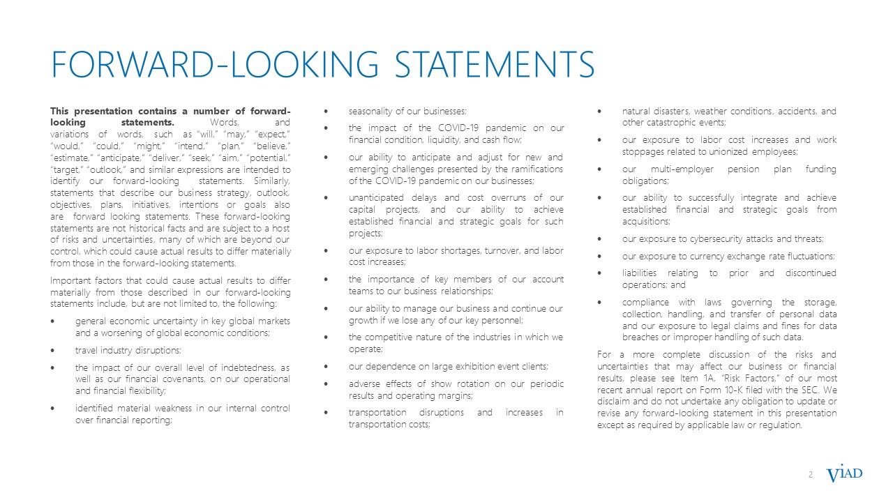 NON-GAAP FINANCIAL MEASURES  This document includes the presentation of “Adjusted EBITDA” and ”Income (Loss) Before Other Items”, which are supplemental to results presented under accounting principles generally accepted in the United States of America (“GAAP”) and may not be comparable to similarly titled measures presented by other companies.  These non-GAAP measures should be considered in addition to, but not as a substitute for, other similar measures reported in accordance with GAAP.    The use of these non-GAAP financial measures is limited, compared to the GAAP measure of net income attributable to Viad, because it does not consider a variety of items affecting Viad’s consolidated financial performance as explained below.  Because these non-GAAP measures do not consider all items affecting Viad’s consolidated financial performance, a user of Viad’s financial information should consider net income attributable to Viad as an important measure of financial performance because it provides a more complete measure of the Company’s performance.  Adjusted EBITDA is defined by management as net income attributable to Viad before income (loss) from discontinued operations, interest expense and interest income, income taxes, depreciation and amortization, acquisition-related costs, attraction start-up costs, restructuring charges, impairment charges, and the reduction/increase for income/loss attributable to non-redeemable and redeemable non-controlling interests, and gains or losses from sales of businesses.   Adjusted EBITDA is considered a useful operating metric, in addition to net income attributable to Viad, as potential variations arising from non-recurring integration costs, non-cash amortization and depreciation, and non-operational expenses/income are eliminated, thus resulting in an additional measure considered to be indicative of Viad’s consolidated and segment performance. Management believes that the presentation of Adjusted EBITDA provides useful information to investors regarding Viad’s results of operations for trending, analyzing and benchmarking the performance and value of Viad’s business.  Income (Loss) Before Other Items is defined by management as net income attributable to Viad before income (loss) from discontinued operations, acquisition-related costs, attraction start-up costs, restructuring charges, impairment charges, other non-recurring expenses, and tax matters.   Income (Loss) Before Other Items is considered a useful operating metric, in addition to net income attributable to Viad, as potential variations arising from non-operational expenses/income are eliminated, thus resulting in an additional measure considered to be indicative of Viad’s performance.   3  Forward-Looking Non-GAAP Measures  The company has not quantitatively reconciled its guidance for adjusted EBITDA to its respective most comparable GAAP measure because certain reconciling items that impact this metric including, provision for income taxes, interest expense, restructuring or impairment charges, acquisition-related costs, and attraction start-up costs have not occurred, are out of the company’s control, or cannot be reasonably predicted. Accordingly, reconciliations to the nearest GAAP financial measure are not available without unreasonable effort. Please note that the unavailable reconciling items could significantly impact the company’s results as reported under GAAP.