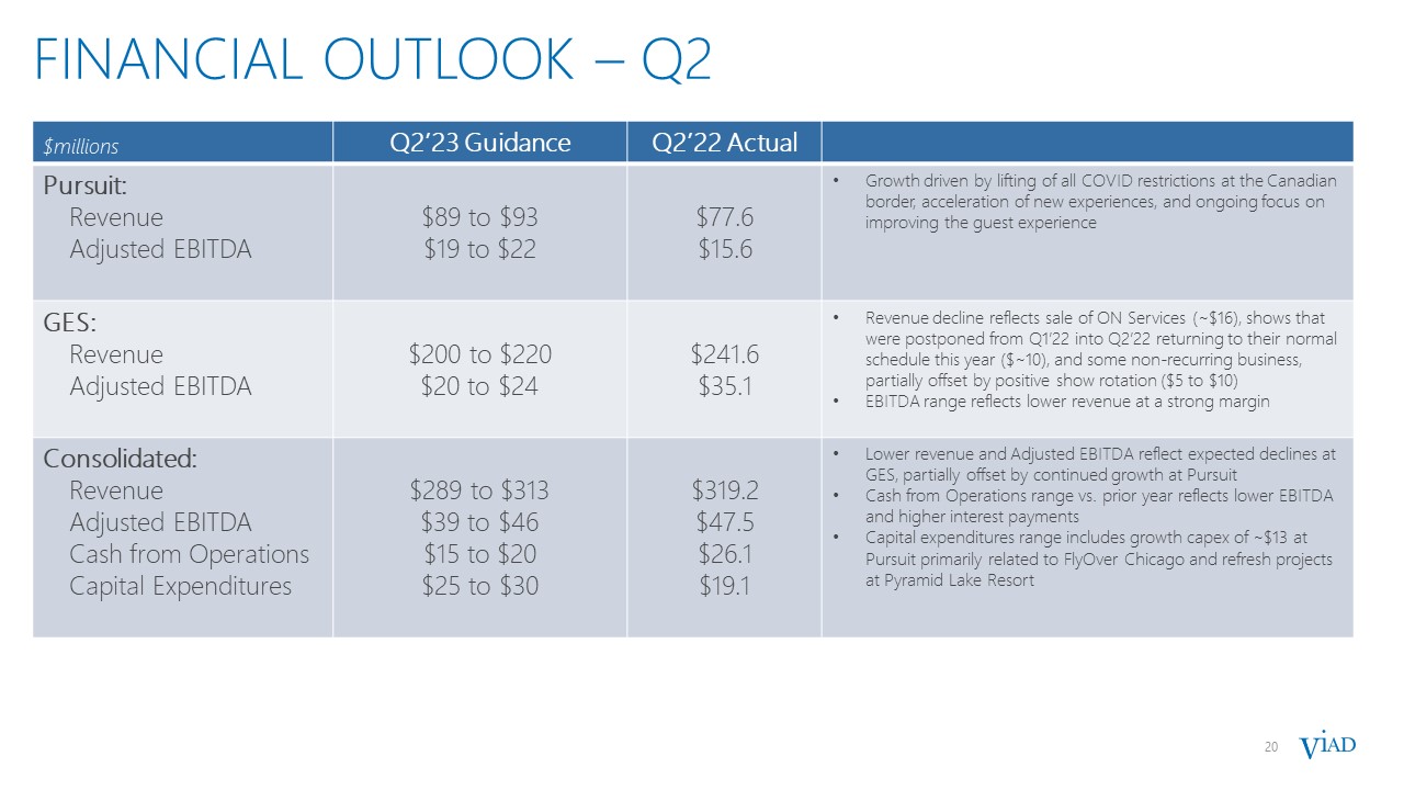 19  FINANCIAL OUTLOOK – Full Year  19  $millions  FY’23 Guidance  FY’22 Actual  Pursuit:  Revenue  Adjusted EBITDA  Up ~10% to 15%  $85 to $95  $299.3  $67.9  Unchanged from prior guidance  Revenue growth driven by lifting of all COVID restrictions at the Canadian border, acceleration of new experiences, and ongoing focus on improving the guest experience  Margin improves as visitation increases, the performance of newer experiences improves, and pandemic-era cost pressures ease   GES:  Revenue  Adjusted EBITDA  Down low-single digits  $52 to $60  $828.0  $61.3  Raised vs. prior guidance  Revenue decline reflects negative show rotation (~$30) and sale of ON Services (~$50), largely offset by stronger demand for exhibition and event services and new Spiro wins  EBITDA range reflects lower revenue, full run rate SG&A for GES Exhibitions and select investments in talent and capabilities at Spiro to fuel growth in 2023 and beyond  Consolidated:  Revenue  Adjusted EBITDA  Cash from Operations  Capital Expenditures  Up low-single digits  $124 to $141  $70 to $80  $70 to $75  $1,127.3  $116.1  $73.4  $67.2  Revenue, Adjusted EBITDA and Cash from Operations all raised from prior guidance on improved outlook for GES  Cash from Operations also improved from prior guidance; range vs. prior year reflects higher EBITDA partially offset by higher interest and tax payments  Capital expenditures reduced from prior guidance on revised timing of select Refresh, Build, Buy growth projects; range includes growth capex of ~$35 at Pursuit primarily related to FlyOver Chicago and refresh projects at Pyramid Lake Resort
