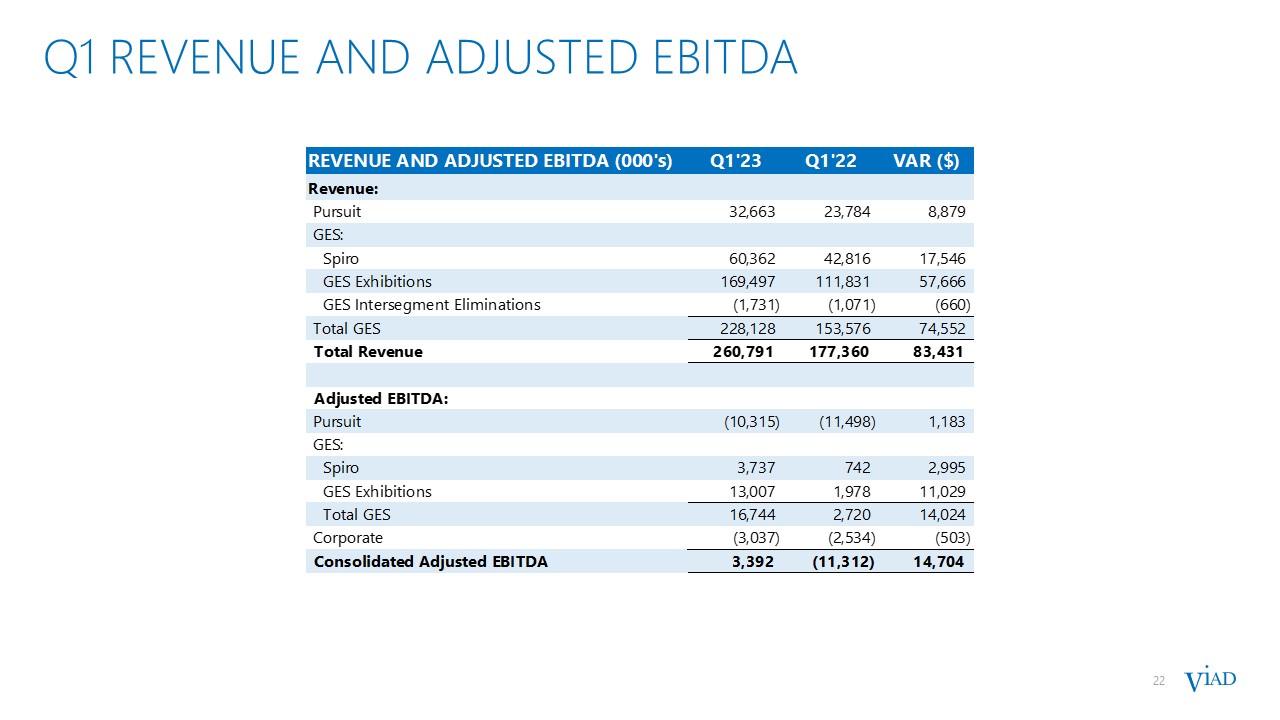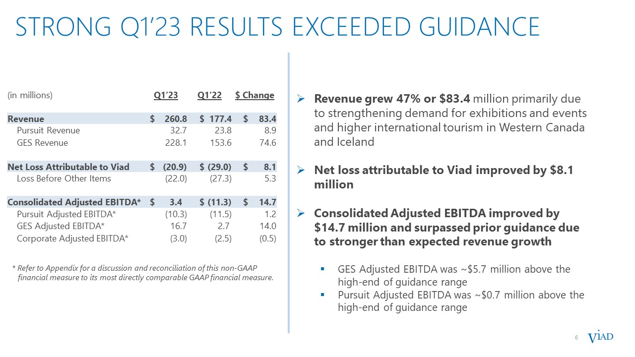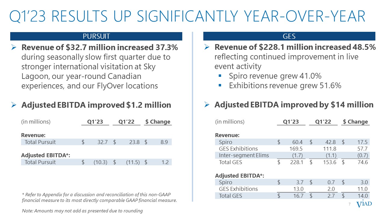 6  strong Q1’23 RESULTS exceeded GUIDANCE  6  Revenue grew 47% or $83.4 million primarily due to strengthening demand for exhibitions and events and higher international tourism in Western Canada and Iceland  Net loss attributable to Viad improved by $8.1 million   Consolidated Adjusted EBITDA improved by $14.7 million and surpassed prior guidance due to stronger than expected revenue growth  GES Adjusted EBITDA was ~$5.7 million above the high-end of guidance range  Pursuit Adjusted EBITDA was ~$0.7 million above the high-end of guidance range  * Refer to Appendix for a discussion and reconciliation of this non-GAAP financial measure to its most directly comparable GAAP financial measure.  (in millions)​  Q1’23​  Q1’22  $ Change   ​   ​  ​  ​  Revenue​  $​  260.8​  $  177.4    $  83.4   ​  Pursuit Revenue​  ​     32.7  23.8  8.9   ​  GES Revenue​  ​    228.1​  153.6  74.6   ​   ​  ​   ​  Net Loss Attributable to Viad​  $​    (20.9)  $  (29.0)  $  8.1  ​  ​Loss Before Other Items  ​  (22.0)​  (27.3)  5.3  ​  ​  ​  Consolidated Adjusted EBITDA*​  $​  3.4    $  (11.3)  $  14.7   ​  Pursuit Adjusted EBITDA*​   ​    (10.3)​  (11.5)  1.2   ​  GES Adjusted EBITDA*​   ​      16.7  2.7   14.0   ​  Corporate Adjusted EBITDA*​   ​      (3.0)​  (2.5)  (0.5)