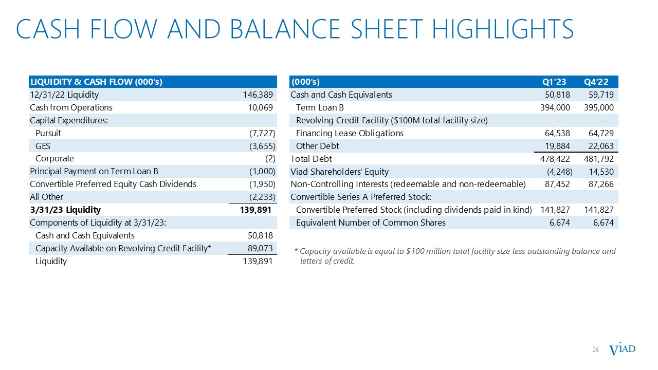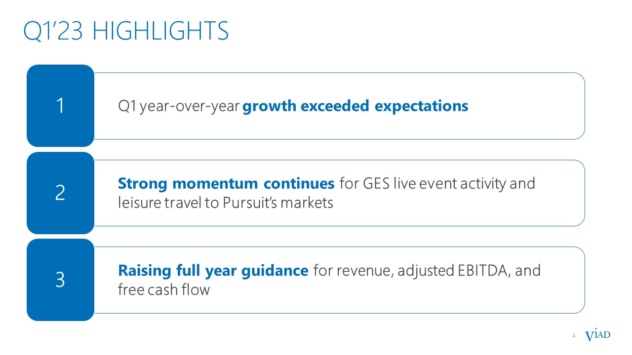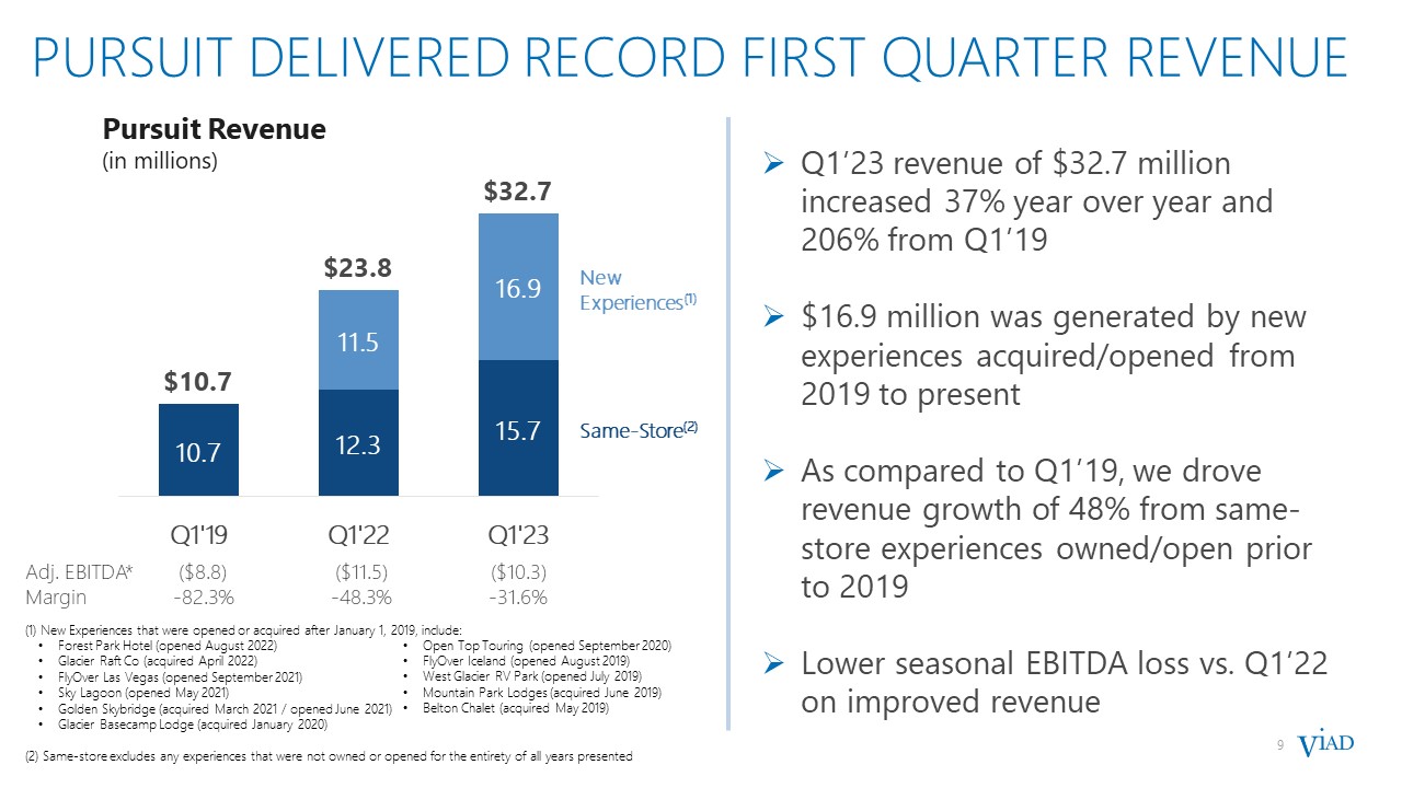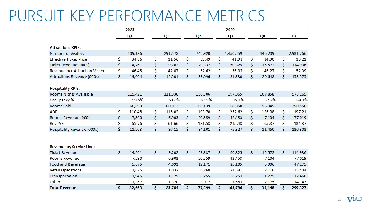 6  strong Q1’23 RESULTS exceeded GUIDANCE  6  Revenue grew 47% or $83.4 million primarily due to strengthening demand for exhibitions and events and higher international tourism in Western Canada and Iceland  Net loss attributable to Viad improved by $8.1 million   Consolidated Adjusted EBITDA improved by $14.7 million and surpassed prior guidance due to stronger than expected revenue growth  GES Adjusted EBITDA was ~$5.7 million above the high-end of guidance range  Pursuit Adjusted EBITDA was ~$0.7 million above the high-end of guidance range  * Refer to Appendix for a discussion and reconciliation of this non-GAAP financial measure to its most directly comparable GAAP financial measure.  (in millions)​  Q1’23​  Q1’22  $ Change   ​   ​  ​  ​  Revenue​  $​  260.8​  $  177.4    $  83.4   ​  Pursuit Revenue​  ​     32.7  23.8  8.9   ​  GES Revenue​  ​    228.1​  153.6  74.6   ​   ​  ​   ​  Net Loss Attributable to Viad​  $​    (20.9)  $  (29.0)  $  8.1  ​  ​Loss Before Other Items  ​  (22.0)​  (27.3)  5.3  ​  ​  ​  Consolidated Adjusted EBITDA*​  $​  3.4    $  (11.3)  $  14.7   ​  Pursuit Adjusted EBITDA*​   ​    (10.3)​  (11.5)  1.2   ​  GES Adjusted EBITDA*​   ​      16.7  2.7   14.0   ​  Corporate Adjusted EBITDA*​   ​      (3.0)​  (2.5)  (0.5)