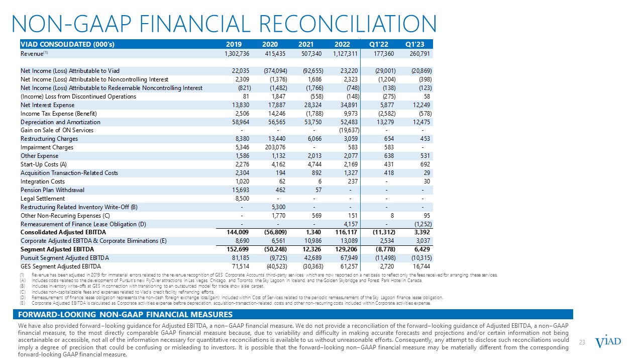 FORWARD-LOOKING NON-GAAP FINANCIAL MEASURES  We have also provided forward−looking guidance for Adjusted EBITDA, a non−GAAP financial measure. We do not provide a reconciliation of the forward−looking guidance of Adjusted EBITDA, a non−GAAP financial measure, to the most directly comparable GAAP financial measure because, due to variability and difficulty in making accurate forecasts and projections and/or certain information not being ascertainable or accessible, not all of the information necessary for quantitative reconciliations is available to us without unreasonable efforts. Consequently, any attempt to disclose such reconciliations would imply a degree of precision that could be confusing or misleading to investors. It is possible that the forward−looking non−GAAP financial measure may be materially different from the corresponding forward-looking GAAP financial measure.  NON-GAAP FINANCIAL RECONCILIATION  23  Revenue has been adjusted in 2019 for immaterial errors related to the revenue recognition of GES’ Corporate Accounts’ third-party services, which are now reported on a net basis to reflect only the fees received for arranging these services.  Includes costs related to the development of Pursuit's new FlyOver attractions in Las Vegas, Chicago, and Toronto, the Sky Lagoon in Iceland, and the Golden Skybridge and Forest Park Hotel in Canada.  Includes inventory write-offs at GES in connection with transitioning to an outsourced model for trade show aisle carpet.   Includes non-capitalizable fees and expenses related to Viad’s credit facility refinancing efforts.  Remeasurement of finance lease obligation represents the non-cash foreign exchange loss/(gain) included within Cost of Services related to the periodic remeasurement of the Sky Lagoon finance lease obligation.  Corporate Adjusted EBITDA is calculated as Corporate activities expense before depreciation, acquisition-transaction-related costs and other non-recurring costs included within Corporate activities expense.