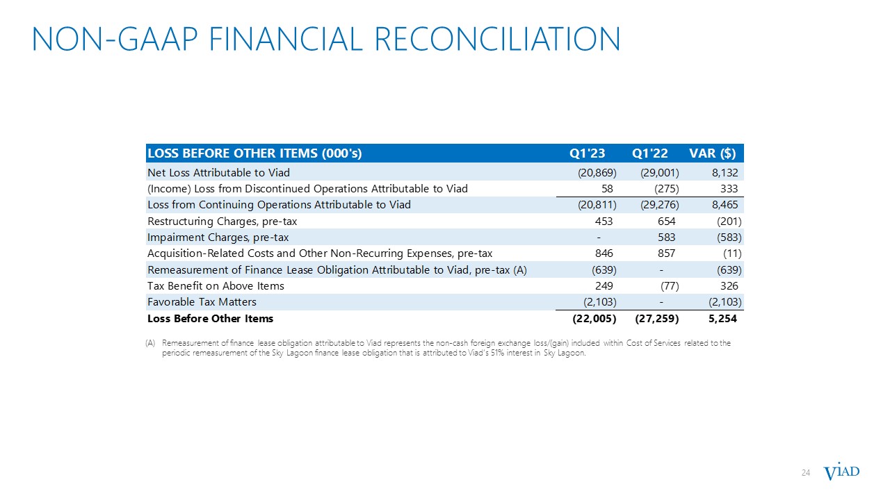 24  NON-GAAP FINANCIAL RECONCILIATION  Remeasurement of finance lease obligation attributable to Viad represents the non-cash foreign exchange loss/(gain) included within Cost of Services related to the periodic remeasurement of the Sky Lagoon finance lease obligation that is attributed to Viad’s 51% interest in Sky Lagoon.