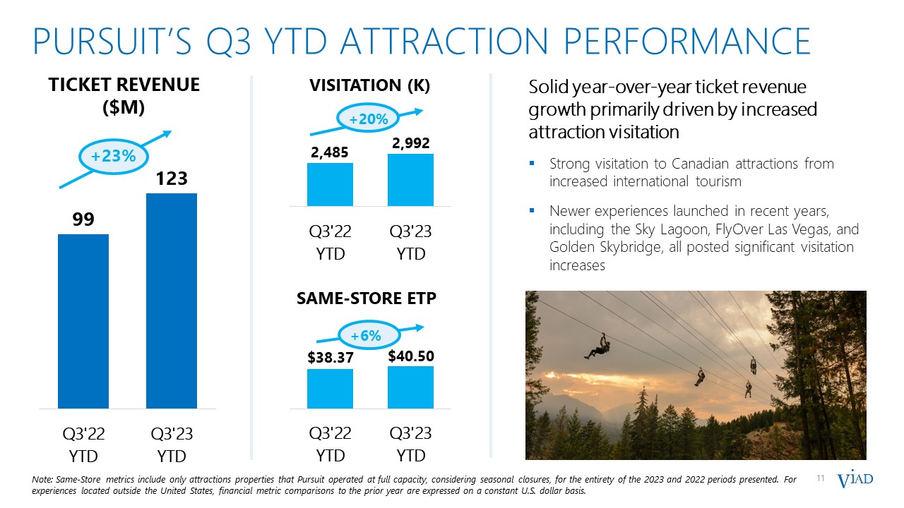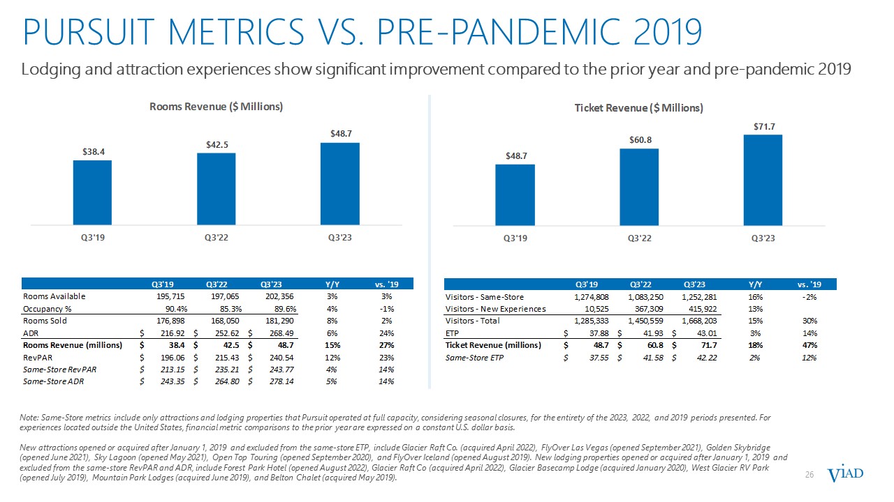PURSUIT METRICS vs. pre-pandemic 2019  26  Note: Same-Store metrics include only attractions and lodging properties that Pursuit operated at full capacity, considering seasonal closures, for the entirety of the 2023, 2022, and 2019 periods presented. For experiences located outside the United States, financial metric comparisons to the prior year are expressed on a constant U.S. dollar basis.  New attractions opened or acquired after January 1, 2019 and excluded from the same-store ETP, include Glacier Raft Co. (acquired April 2022), FlyOver Las Vegas (opened September 2021), Golden Skybridge (opened June 2021), Sky Lagoon (opened May 2021), Open Top Touring (opened September 2020), and FlyOver Iceland (opened August 2019). New lodging properties opened or acquired after January 1, 2019 and excluded from the same-store RevPAR and ADR, include Forest Park Hotel (opened August 2022), Glacier Raft Co (acquired April 2022), Glacier Basecamp Lodge (acquired January 2020), West Glacier RV Park (opened July 2019), Mountain Park Lodges (acquired June 2019), and Belton Chalet (acquired May 2019).   Lodging and attraction experiences show significant improvement compared to the prior year and pre-pandemic 2019