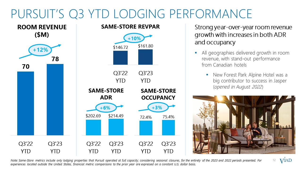 11  PURSUIT’s Q3 YTD attraction PERFORMANCE  TICKET REVENUE ($M)  +23%  2023F  2024P  Solid year-over-year ticket revenue growth primarily driven by increased attraction visitation  Strong visitation to Canadian attractions from increased international tourism  Newer experiences launched in recent years, including the Sky Lagoon, FlyOver Las Vegas, and Golden Skybridge, all posted significant visitation increases  VISITATION (K)  SAME-STORE ETP  +20%  +6%  Note: Same-Store metrics include only attractions properties that Pursuit operated at full capacity, considering seasonal closures, for the entirety of the 2023 and 2022 periods presented. For experiences located outside the United States, financial metric comparisons to the prior year are expressed on a constant U.S. dollar basis.