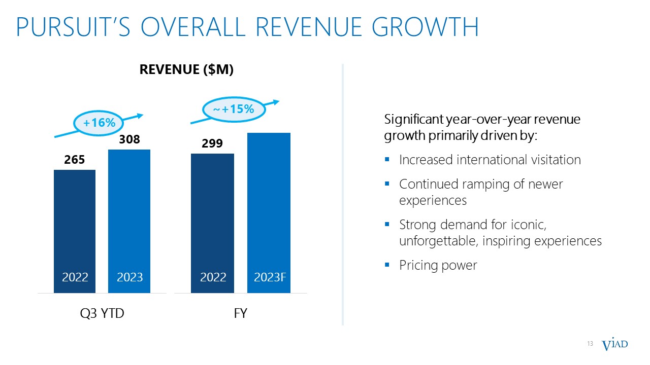 12  PURSUIT’s Q3 YTD LODGING PERFORMANCE  ROOM REVENUE ($M)  +12%  2023F  2024P  Strong year-over-year room revenue growth with increases in both ADR and occupancy  All geographies delivered growth in room revenue, with stand-out performance from Canadian hotels  New Forest Park Alpine Hotel was a big contributor to success in Jasper (opened in August 2022)  SAME-STORE   ADR  SAME-STORE OCCUPANCY  +3%  SAME-STORE REVPAR  +10%  +6%  Note: Same-Store metrics include only lodging properties that Pursuit operated at full capacity, considering seasonal closures, for the entirety of the 2023 and 2022 periods presented. For experiences located outside the United States, financial metric comparisons to the prior year are expressed on a constant U.S. dollar basis.