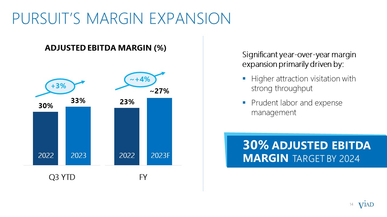 13  PURSUIT’s OVERALL REVENUE GROWTH  REVENUE ($M)  +16%  ~+15%  2022  2023  2022  2023F  Significant year-over-year revenue growth primarily driven by:  Increased international visitation  Continued ramping of newer experiences  Strong demand for iconic, unforgettable, inspiring experiences   Pricing power