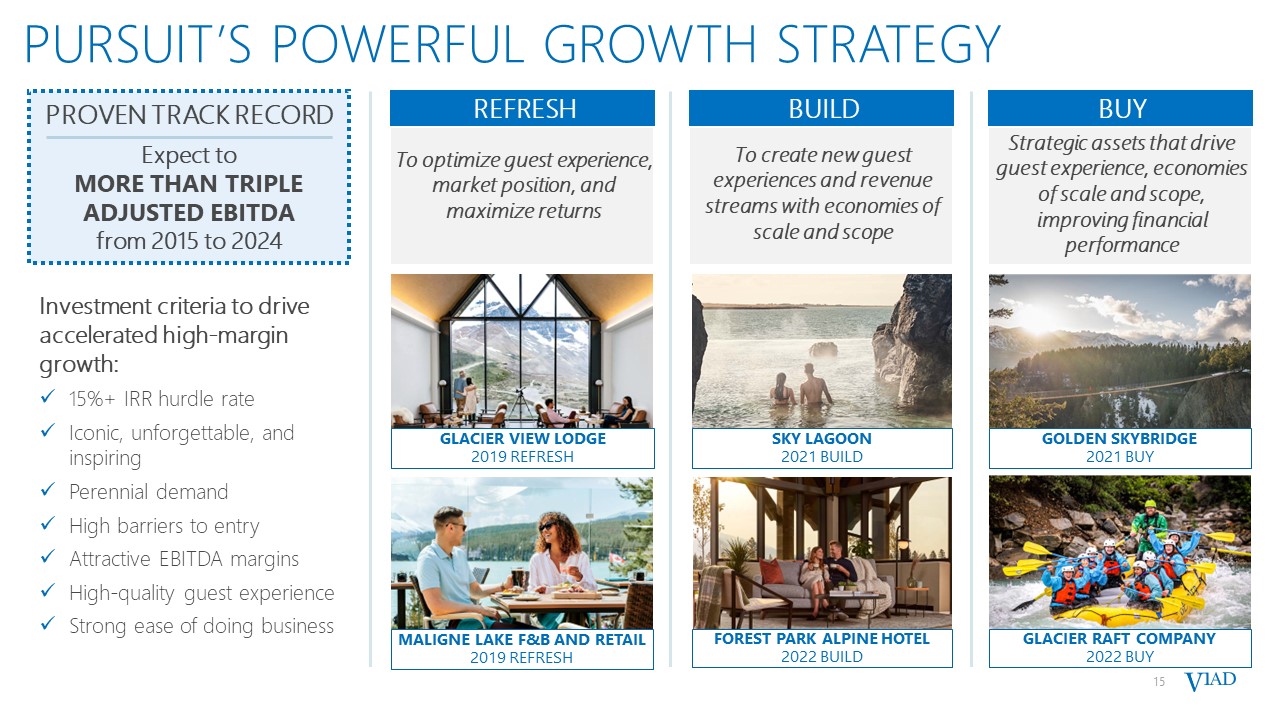 14  PURSUIT’s margin expansion  ADJUSTED EBITDA MARGIN (%)  ~+4%  2022  2023  2022  2023F  Significant year-over-year margin expansion primarily driven by:  Higher attraction visitation with strong throughput  Prudent labor and expense management  +3%  30% ADJUSTED EBITDA MARGIN TARGET BY 2024
