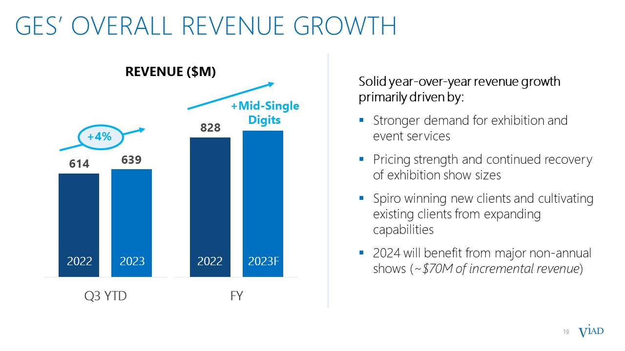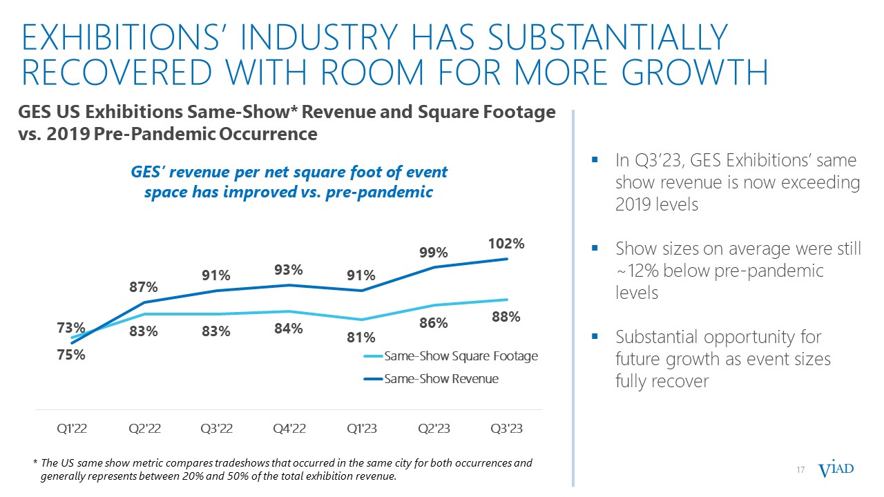17  EXHIBITIONS’ INDUSTRY HAS SUBSTANTIALLYRECOVERED WITH ROOM FOR MORE GROWTH  17  In Q3’23, GES Exhibitions’ same show revenue is now exceeding 2019 levels  Show sizes on average were still ~12% below pre-pandemic levels  Substantial opportunity for future growth as event sizes fully recover  * The US same show metric compares tradeshows that occurred in the same city for both occurrences and generally represents between 20% and 50% of the total exhibition revenue.  GES’ revenue per net square foot of event space has improved vs. pre-pandemic  GES US Exhibitions Same-Show* Revenue and Square Footage  vs. 2019 Pre-Pandemic Occurrence