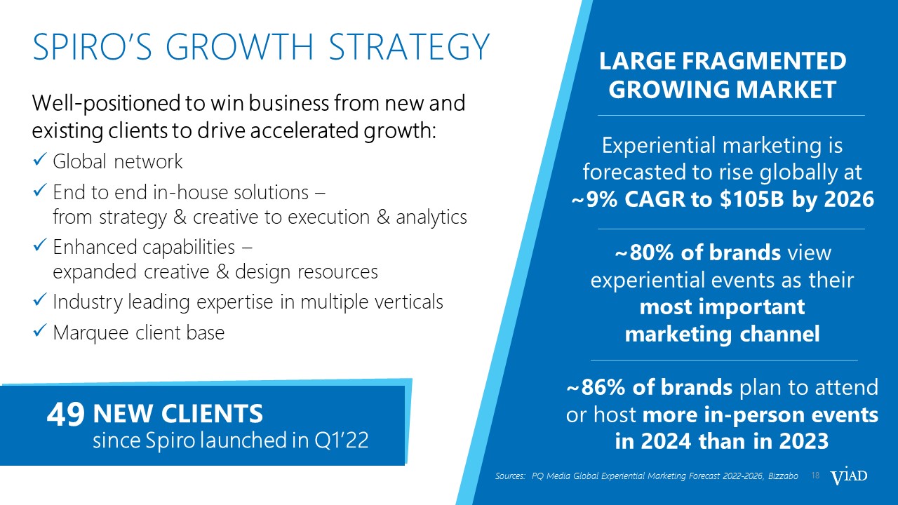 18  SPIRO’S GROWTH STRATEGY  LARGE FRAGMENTED GROWING MARKET  Experiential marketing is forecasted to rise globally at ~9% CAGR to $105B by 2026  ~80% of brands view experiential events as their most important   marketing channel  ~86% of brands plan to attend or host more in-person events in 2024 than in 2023  Sources: PQ Media Global Experiential Marketing Forecast 2022-2026, Bizzabo  Well-positioned to win business from new and existing clients to drive accelerated growth:  Global network  End to end in-house solutions – from strategy & creative to execution & analytics  Enhanced capabilities – expanded creative & design resources  Industry leading expertise in multiple verticals  Marquee client base  NEW CLIENTS  since Spiro launched in Q1’22  49