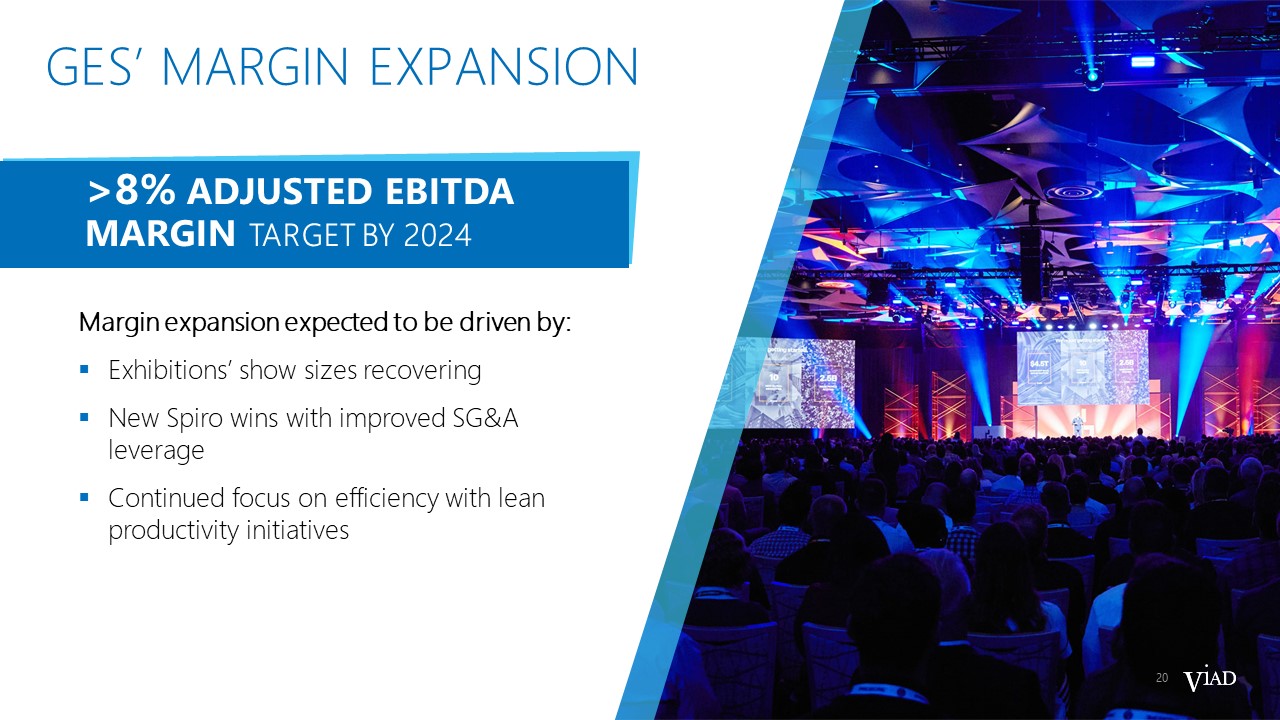 19  GES’ OVERALL REVENUE GROWTH  REVENUE ($M)  +4%  +Mid-Single Digits  2022  2023  2022  2023F  Solid year-over-year revenue growth primarily driven by:  Stronger demand for exhibition and event services  Pricing strength and continued recovery of exhibition show sizes  Spiro winning new clients and cultivating existing clients from expanding capabilities  2024 will benefit from major non-annual shows (~$70M of incremental revenue)
