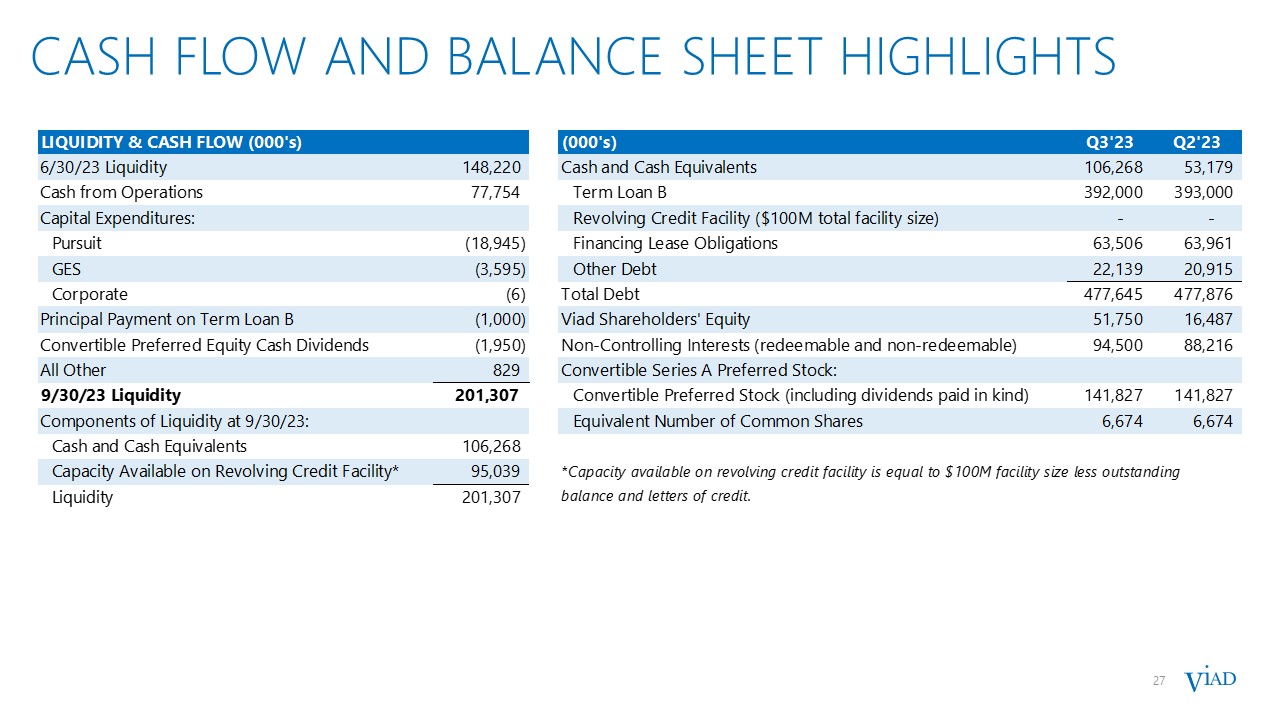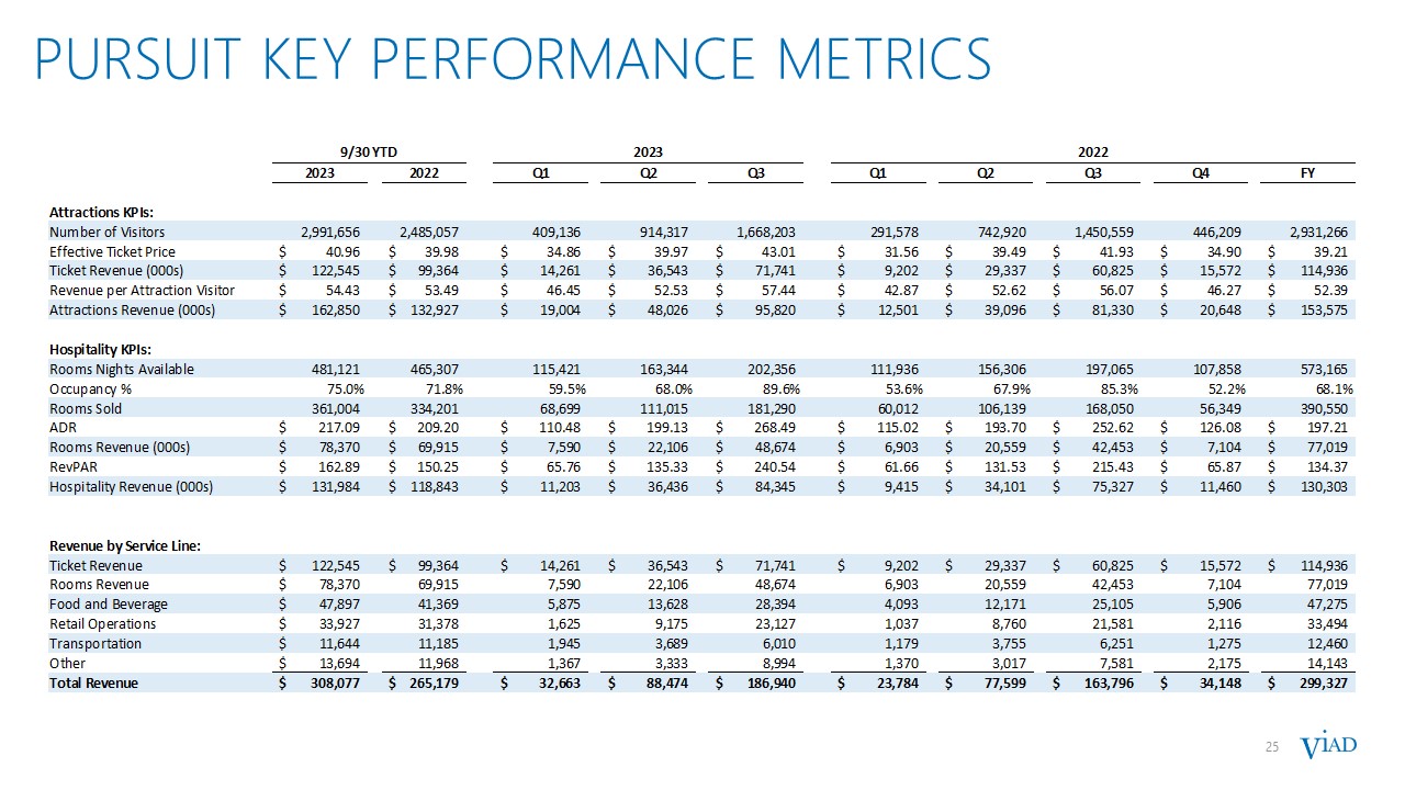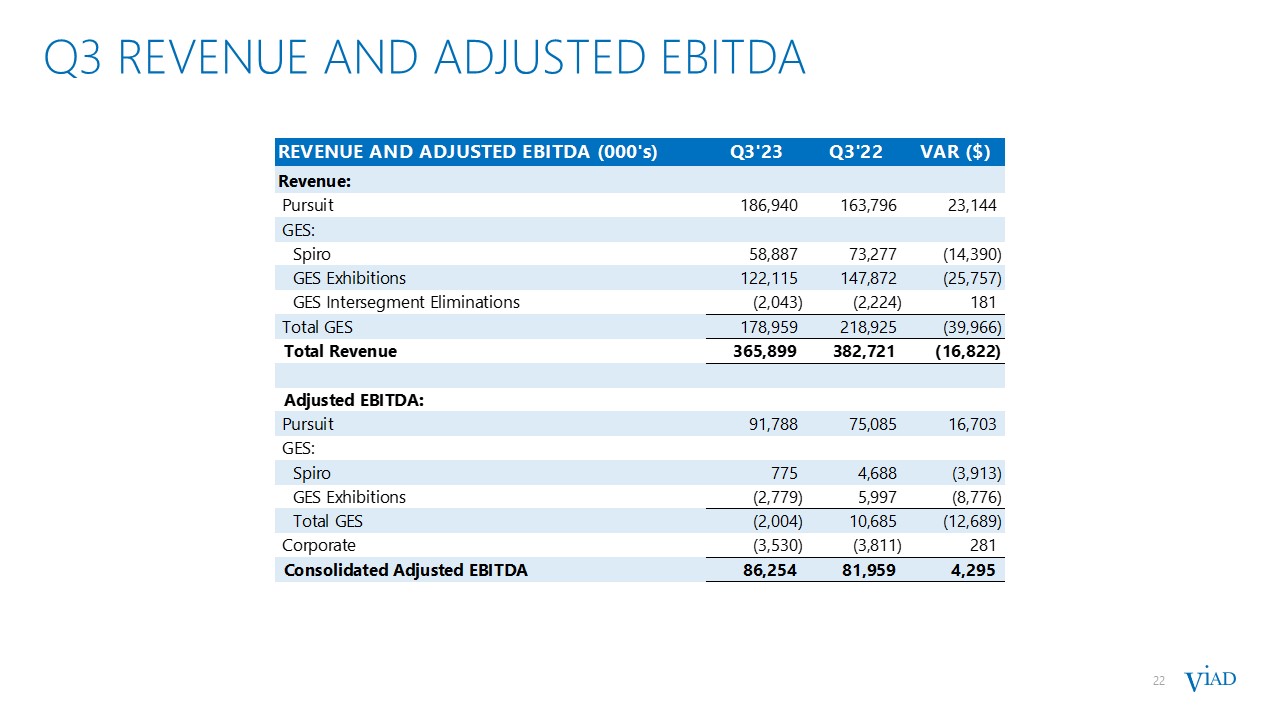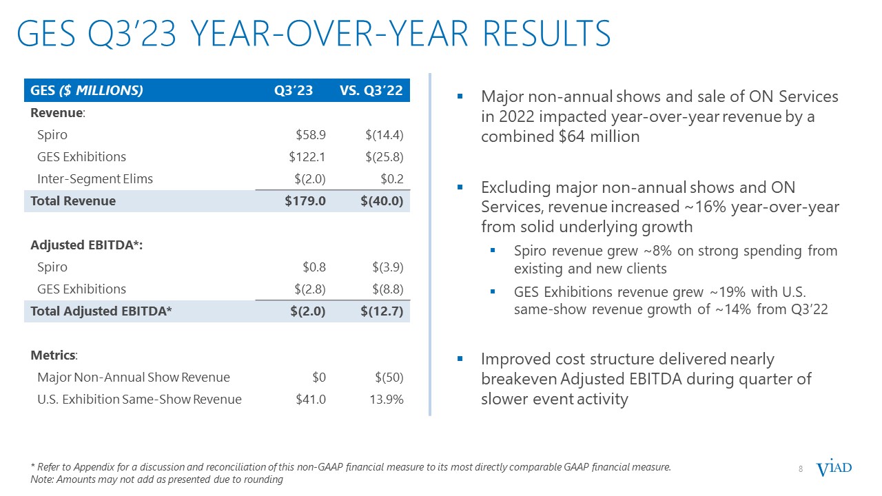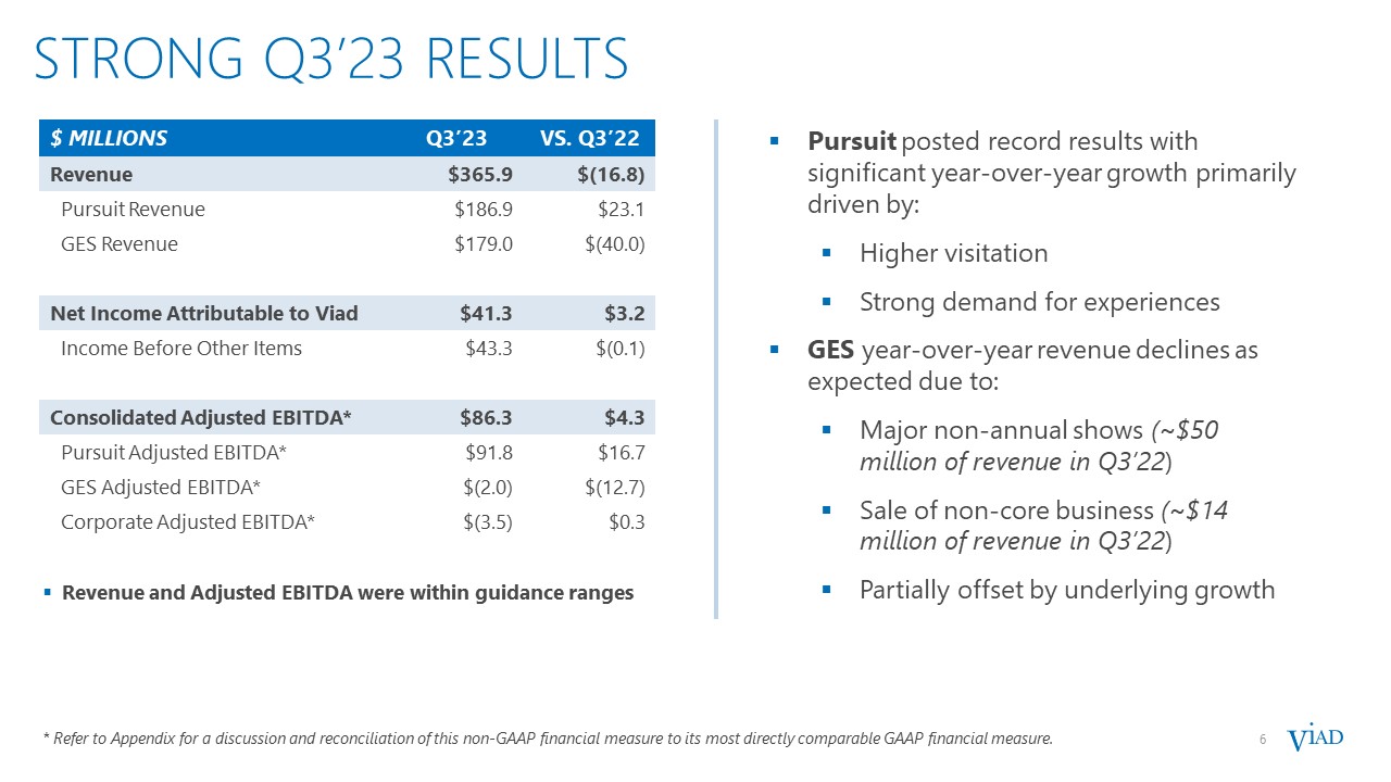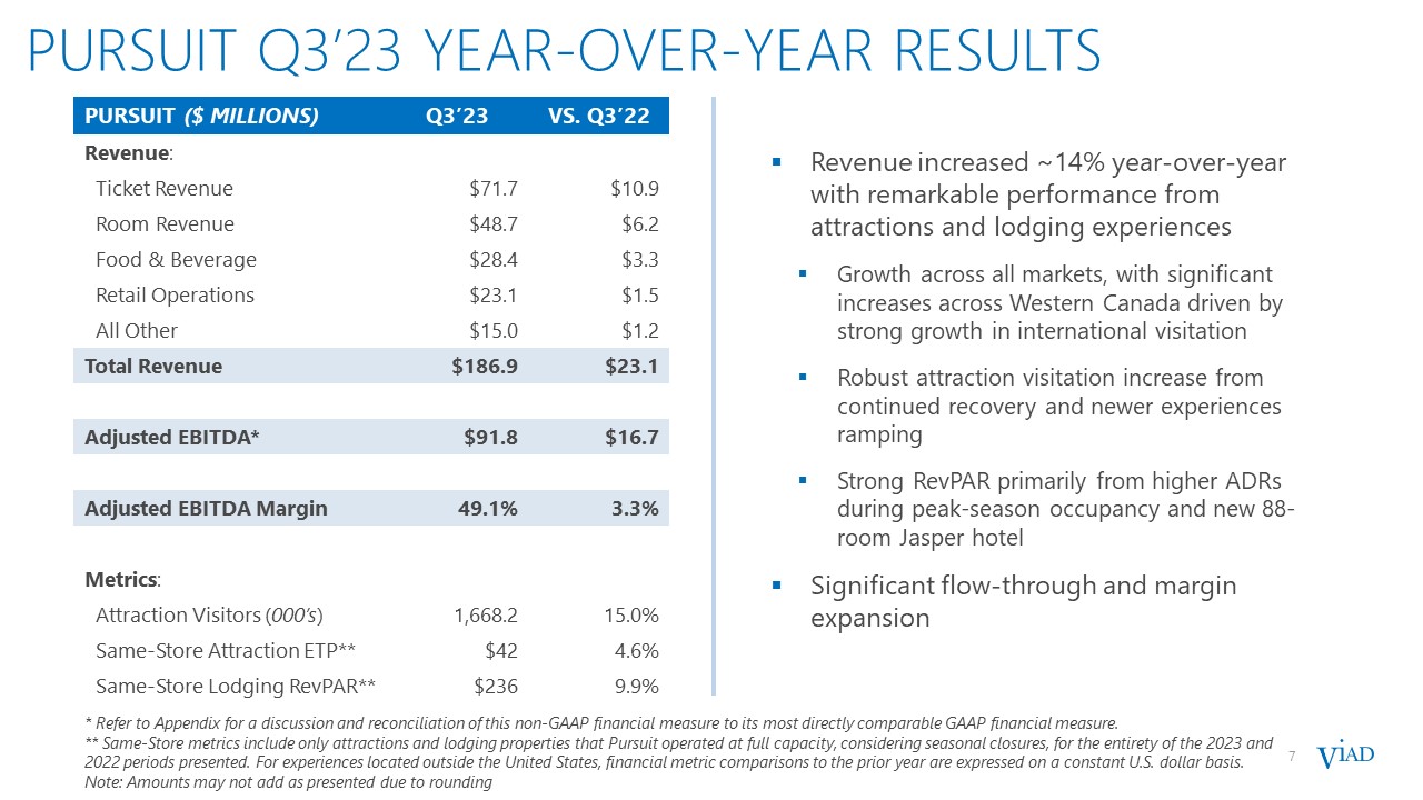 6  strong Q3’23 RESULTS  6  Pursuit posted record results with significant year-over-year growth primarily driven by:  Higher visitation  Strong demand for experiences  GES year-over-year revenue declines as expected due to:  Major non-annual shows (~$50 million of revenue in Q3’22)  Sale of non-core business (~$14 million of revenue in Q3’22)  Partially offset by underlying growth  * Refer to Appendix for a discussion and reconciliation of this non-GAAP financial measure to its most directly comparable GAAP financial measure.  Revenue and Adjusted EBITDA were within guidance ranges  $ MILLIONS  Q3’23  VS. Q3’22  Revenue  $365.9  $(16.8)  Pursuit Revenue  $186.9  $23.1  GES Revenue  $179.0  $(40.0)  Net Income Attributable to Viad  $41.3  $3.2  Income Before Other Items  $43.3  $(0.1)  Consolidated Adjusted EBITDA*  $86.3  $4.3  Pursuit Adjusted EBITDA*  $91.8  $16.7  GES Adjusted EBITDA*  $(2.0)  $(12.7)  Corporate Adjusted EBITDA*  $(3.5)  $0.3