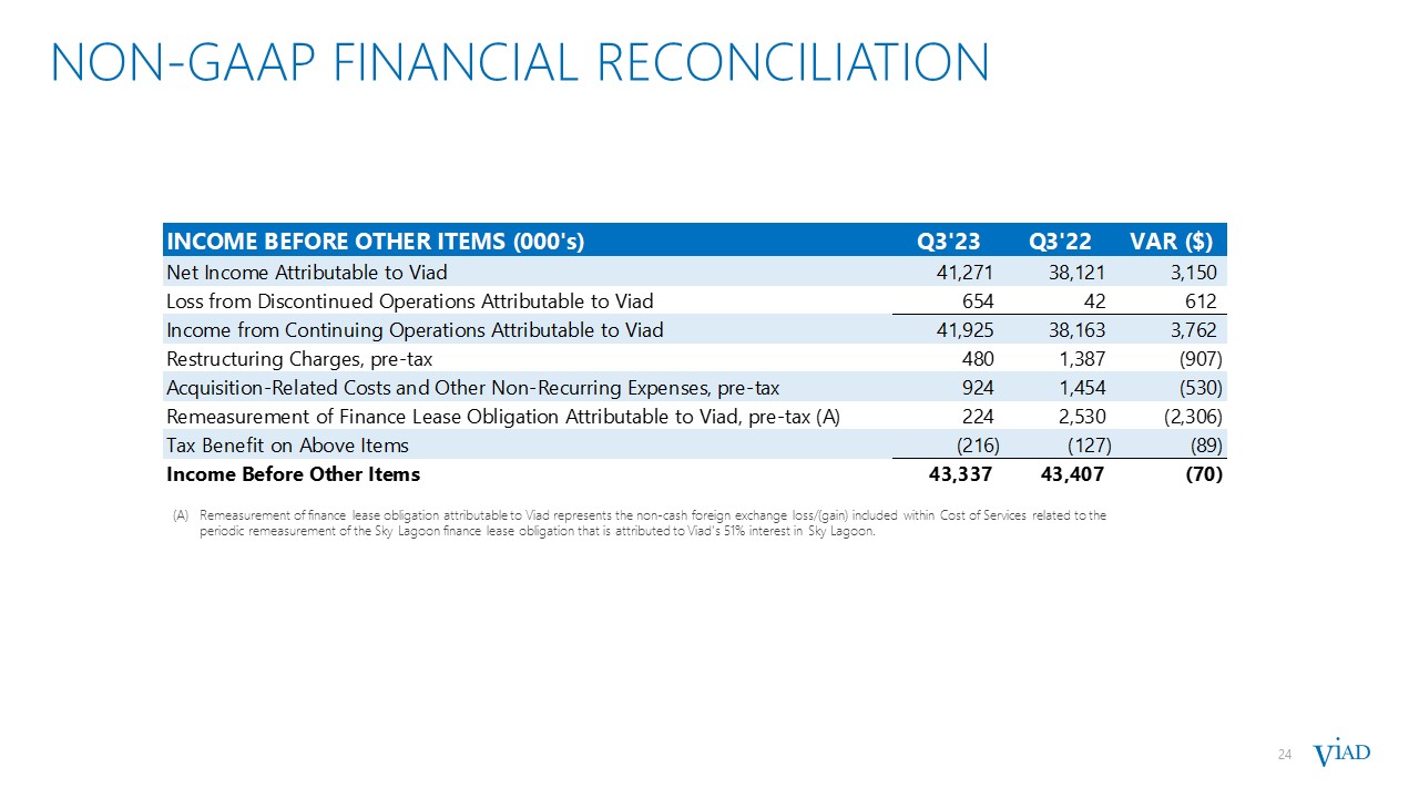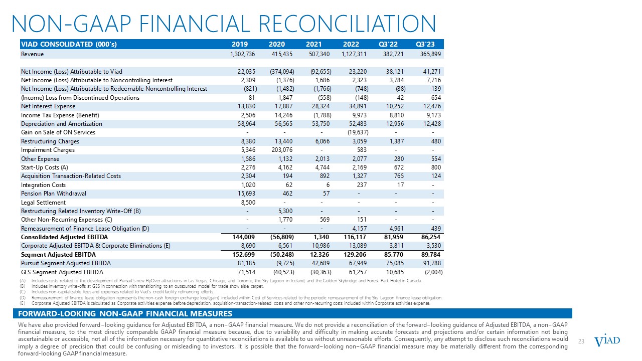 FORWARD-LOOKING NON-GAAP FINANCIAL MEASURES  We have also provided forward−looking guidance for Adjusted EBITDA, a non−GAAP financial measure. We do not provide a reconciliation of the forward−looking guidance of Adjusted EBITDA, a non−GAAP financial measure, to the most directly comparable GAAP financial measure because, due to variability and difficulty in making accurate forecasts and projections and/or certain information not being ascertainable or accessible, not all of the information necessary for quantitative reconciliations is available to us without unreasonable efforts. Consequently, any attempt to disclose such reconciliations would imply a degree of precision that could be confusing or misleading to investors. It is possible that the forward−looking non−GAAP financial measure may be materially different from the corresponding forward-looking GAAP financial measure.  NON-GAAP FINANCIAL RECONCILIATION  23  Includes costs related to the development of Pursuit's new FlyOver attractions in Las Vegas, Chicago, and Toronto, the Sky Lagoon in Iceland, and the Golden Skybridge and Forest Park Hotel in Canada.  Includes inventory write-offs at GES in connection with transitioning to an outsourced model for trade show aisle carpet.   Includes non-capitalizable fees and expenses related to Viad’s credit facility refinancing efforts.  Remeasurement of finance lease obligation represents the non-cash foreign exchange loss/(gain) included within Cost of Services related to the periodic remeasurement of the Sky Lagoon finance lease obligation.  Corporate Adjusted EBITDA is calculated as Corporate activities expense before depreciation, acquisition-transaction-related costs and other non-recurring costs included within Corporate activities expense.