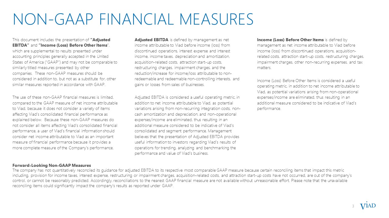 NON-GAAP FINANCIAL MEASURES  This document includes the presentation of “Adjusted EBITDA” and ”Income (Loss) Before Other Items”, which are supplemental to results presented under accounting principles generally accepted in the United States of America (“GAAP”) and may not be comparable to similarly titled measures presented by other companies.  These non-GAAP measures should be considered in addition to, but not as a substitute for, other similar measures reported in accordance with GAAP.    The use of these non-GAAP financial measures is limited, compared to the GAAP measure of net income attributable to Viad, because it does not consider a variety of items affecting Viad’s consolidated financial performance as explained below.  Because these non-GAAP measures do not consider all items affecting Viad’s consolidated financial performance, a user of Viad’s financial information should consider net income attributable to Viad as an important measure of financial performance because it provides a more complete measure of the Company’s performance.  Adjusted EBITDA is defined by management as net income attributable to Viad before income (loss) from discontinued operations, interest expense and interest income, income taxes, depreciation and amortization, acquisition-related costs, attraction start-up costs, restructuring charges, impairment charges, and the reduction/increase for income/loss attributable to non-redeemable and redeemable non-controlling interests, and gains or losses from sales of businesses.   Adjusted EBITDA is considered a useful operating metric, in addition to net income attributable to Viad, as potential variations arising from non-recurring integration costs, non-cash amortization and depreciation, and non-operational expenses/income are eliminated, thus resulting in an additional measure considered to be indicative of Viad’s consolidated and segment performance. Management believes that the presentation of Adjusted EBITDA provides useful information to investors regarding Viad’s results of operations for trending, analyzing and benchmarking the performance and value of Viad’s business.  Income (Loss) Before Other Items is defined by management as net income attributable to Viad before income (loss) from discontinued operations, acquisition-related costs, attraction start-up costs, restructuring charges, impairment charges, other non-recurring expenses, and tax matters.   Income (Loss) Before Other Items is considered a useful operating metric, in addition to net income attributable to Viad, as potential variations arising from non-operational expenses/income are eliminated, thus resulting in an additional measure considered to be indicative of Viad’s performance.   3  Forward-Looking Non-GAAP Measures  The company has not quantitatively reconciled its guidance for adjusted EBITDA to its respective most comparable GAAP measure because certain reconciling items that impact this metric including, provision for income taxes, interest expense, restructuring or impairment charges, acquisition-related costs, and attraction start-up costs have not occurred, are out of the company’s control, or cannot be reasonably predicted. Accordingly, reconciliations to the nearest GAAP financial measure are not available without unreasonable effort. Please note that the unavailable reconciling items could significantly impact the company’s results as reported under GAAP.