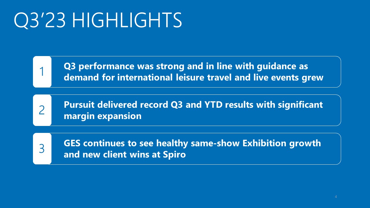 Forward-looking statements  This presentation contains a number of forward-looking statements. Words, and variations  of  words,  such  as “will,” “may,” “expect,” “would,” “could,” “might,” “intend,” “plan,” “believe,” “estimate,” “anticipate,” “deliver,” “seek,” “aim,” “potential,” “target,” “outlook,” and similar expressions are intended to identify our forward-looking  statements. Similarly, statements that describe our business strategy, outlook, objectives, plans, initiatives, intentions or goals also are  forward looking statements. These forward-looking statements are not historical facts and are subject to a host of risks and uncertainties, many of which are beyond our control, which could cause actual results to differ materially from those in the forward-looking statements.   Important factors that could cause actual results to differ materially from those described in our forward-looking statements include, but are not limited to, the following:  general economic uncertainty in key global markets and a worsening of global economic conditions;  travel industry disruptions;  the impact of our overall level of indebtedness, as well as our financial covenants, on our operational and financial flexibility;  identified material weakness in our internal control over financial reporting;  seasonality of our businesses;  the impact of the COVID-19 pandemic on our financial condition, liquidity, and cash flow;  our ability to anticipate and adjust for new and emerging challenges presented by the ramifications of the COVID-19 pandemic on our businesses;  unanticipated delays and cost overruns of our capital projects, and our ability to achieve established financial and strategic goals for such projects;  our exposure to labor shortages, turnover, and labor cost increases;  the importance of key members of our account teams to our business relationships;  our ability to manage our business and continue our growth if we lose any of our key personnel;  the competitive nature of the industries in which we operate;  our dependence on large exhibition event clients;  adverse effects of show rotation on our periodic results and operating margins;  transportation disruptions and increases in transportation costs;  natural disasters, weather conditions, accidents, and other catastrophic events;  our exposure to labor cost increases and work stoppages related to unionized employees;  our multi-employer pension plan funding obligations;  our ability to successfully integrate and achieve established financial and strategic goals from acquisitions;  our exposure to cybersecurity attacks and threats;   our exposure to currency exchange rate fluctuations;  liabilities relating to prior and discontinued operations; and  compliance with laws governing the storage, collection, handling, and transfer of personal data and our exposure to legal claims and fines for data breaches or improper handling of such data.  For a more complete discussion of the risks and uncertainties that may affect our business or financial results, please see Item 1A, “Risk Factors,” of our most recent annual report on Form 10-K filed with the SEC. We disclaim and do not undertake any obligation to update or revise any forward-looking statement in this presentation except as required by applicable law or regulation.  2