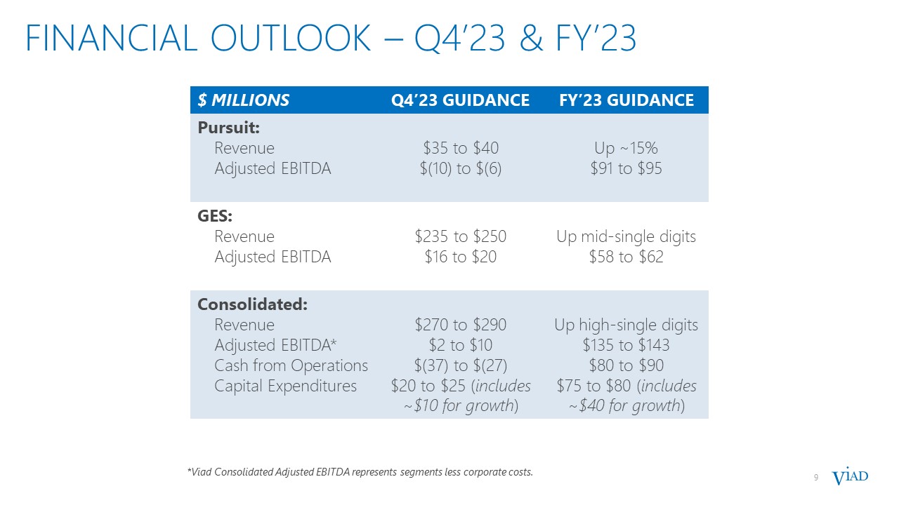 8  GES Q3’23 YEAR-OVER-YEAR RESULTS  8  Major non-annual shows and sale of ON Services in 2022 impacted year-over-year revenue by a combined $64 million  Excluding major non-annual shows and ON Services, revenue increased ~16% year-over-year from solid underlying growth  Spiro revenue grew ~8% on strong spending from existing and new clients  GES Exhibitions revenue grew ~19% with U.S. same-show revenue growth of ~14% from Q3’22  Improved cost structure delivered nearly breakeven Adjusted EBITDA during quarter of slower event activity  GES ($ MILLIONS)  Q3’23  VS. Q3’22  Revenue:  Spiro  $58.9  $(14.4)  GES Exhibitions  $122.1  $(25.8)  Inter-Segment Elims  $(2.0)  $0.2  Total Revenue  $179.0  $(40.0)  Adjusted EBITDA*:  Spiro  $0.8  $(3.9)  GES Exhibitions  $(2.8)  $(8.8)  Total Adjusted EBITDA*  $(2.0)  $(12.7)  Metrics:  Major Non-Annual Show Revenue  $0  $(50)  U.S. Exhibition Same-Show Revenue  $41.0  13.9%  * Refer to Appendix for a discussion and reconciliation of this non-GAAP financial measure to its most directly comparable GAAP financial measure.  Note: Amounts may not add as presented due to rounding