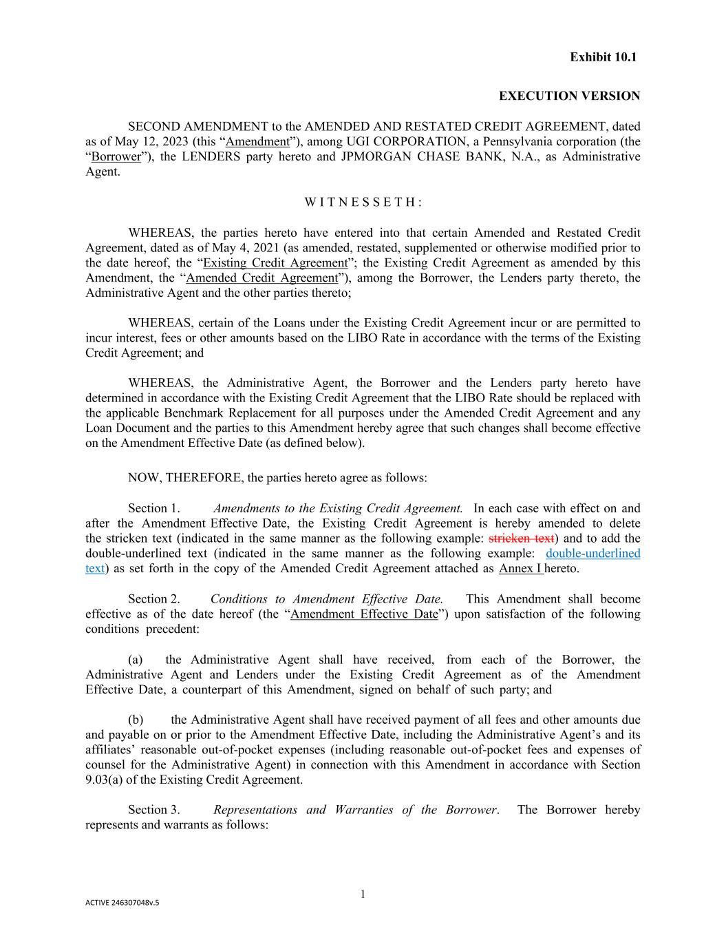 1 EXECUTION VERSION SECOND AMENDMENT to the AMENDED AND RESTATED CREDIT AGREEMENT, dated as of May 12, 2023 (this “Amendment”), among UGI CORPORATION, a Pennsylvania corporation (the “Borrower”), the LENDERS party hereto and JPMORGAN CHASE BANK, N.A., as Administrative Agent. W I T N E S S E T H : WHEREAS, the parties hereto have entered into that certain Amended and Restated Credit Agreement, dated as of May 4, 2021 (as amended, restated, supplemented or otherwise modified prior to the date hereof, the “Existing Credit Agreement”; the Existing Credit Agreement as amended by this Amendment, the “Amended Credit Agreement”), among the Borrower, the Lenders party thereto, the Administrative Agent and the other parties thereto; WHEREAS, certain of the Loans under the Existing Credit Agreement incur or are permitted to incur interest, fees or other amounts based on the LIBO Rate in accordance with the terms of the Existing Credit Agreement; and WHEREAS, the Administrative Agent, the Borrower and the Lenders party hereto have determined in accordance with the Existing Credit Agreement that the LIBO Rate should be replaced with the applicable Benchmark Replacement for all purposes under the Amended Credit Agreement and any Loan Document and the parties to this Amendment hereby agree that such changes shall become effective on the Amendment Effective Date (as defined below). NOW, THEREFORE, the parties hereto agree as follows: Section 1. Amendments to the Existing Credit Agreement. In each case with effect on and after the Amendment Effective Date, the Existing Credit Agreement is hereby amended to delete the stricken text (indicated in the same manner as the following example: stricken text) and to add the double-underlined text (indicated in the same manner as the following example: double-underlined text) as set forth in the copy of the Amended Credit Agreement attached as Annex I hereto. Section 2. Conditions to Amendment Effective Date. This Amendment shall become effective as of the date hereof (the “Amendment Effective Date”) upon satisfaction of the following conditions precedent: (a) the Administrative Agent shall have received, from each of the Borrower, the Administrative Agent and Lenders under the Existing Credit Agreement as of the Amendment Effective Date, a counterpart of this Amendment, signed on behalf of such party; and (b) the Administrative Agent shall have received payment of all fees and other amounts due and payable on or prior to the Amendment Effective Date, including the Administrative Agent’s and its affiliates’ reasonable out-of-pocket expenses (including reasonable out-of-pocket fees and expenses of counsel for the Administrative Agent) in connection with this Amendment in accordance with Section 9.03(a) of the Existing Credit Agreement. Section 3. Representations and Warranties of the Borrower. The Borrower hereby represents and warrants as follows: ACTIVE 246307048v.5 Exhibit 10.1