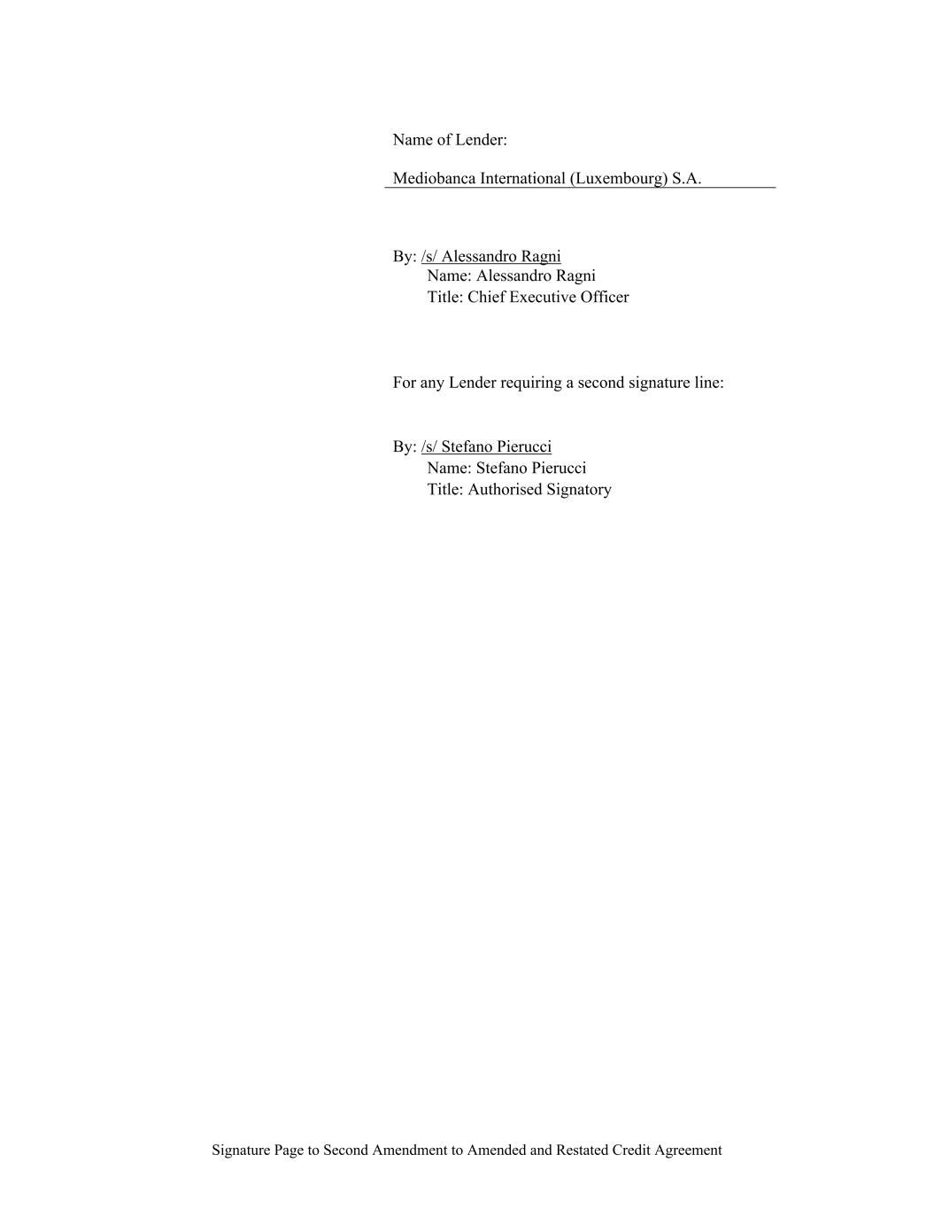 Signature Page to Second Amendment to Amended and Restated Credit Agreement Name of Lender: Mediobanca International (Luxembourg) S.A. By: /s/ Alessandro Ragni Name: Alessandro Ragni Title: Chief Executive Officer For any Lender requiring a second signature line: By: /s/ Stefano Pierucci Name: Stefano Pierucci Title: Authorised Signatory