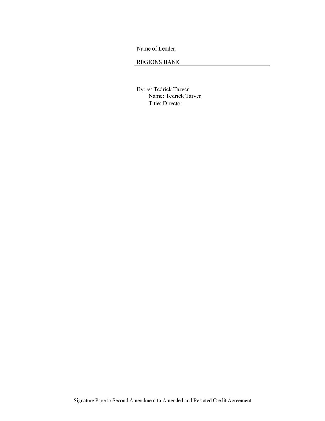 Signature Page to Second Amendment to Amended and Restated Credit Agreement Name of Lender: REGIONS BANK By: /s/ Tedrick Tarver Name: Tedrick Tarver Title: Director