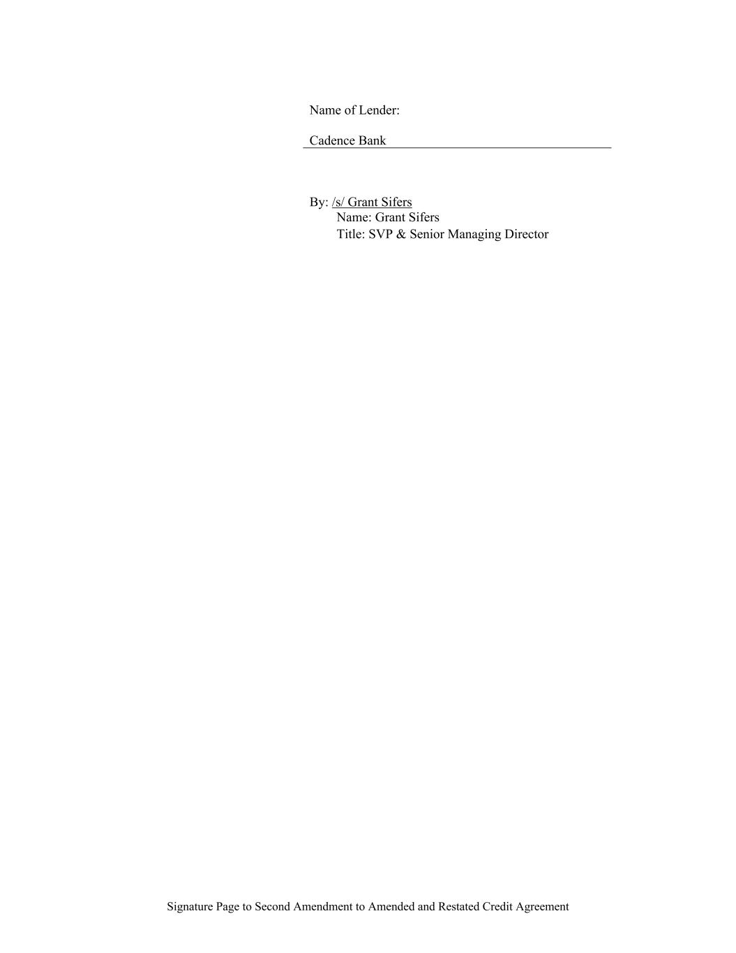 Signature Page to Second Amendment to Amended and Restated Credit Agreement Name of Lender: Cadence Bank By: /s/ Grant Sifers Name: Grant Sifers Title: SVP & Senior Managing Director