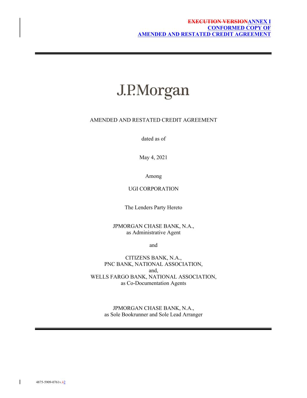 EXECUTION VERSIONANNEX I CONFORMED COPY OF AMENDED AND RESTATED CREDIT AGREEMENT AMENDED AND RESTATED CREDIT AGREEMENT dated as of May 4, 2021 Among UGI CORPORATION The Lenders Party Hereto JPMORGAN CHASE BANK, N.A., as Administrative Agent and CITIZENS BANK, N.A., PNC BANK, NATIONAL ASSOCIATION, and, WELLS FARGO BANK, NATIONAL ASSOCIATION, as Co-Documentation Agents JPMORGAN CHASE BANK, N.A., as Sole Bookrunner and Sole Lead Arranger 4875-5909-0761v.12