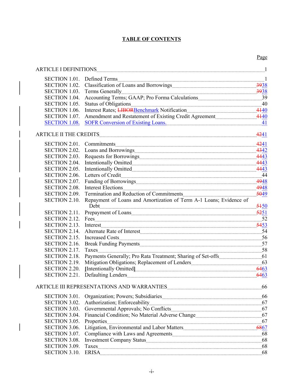 TABLE OF CONTENTS Page ARTICLE I DEFINITIONS 1 SECTION 1.01. Defined Terms 1 SECTION 1.02. Classification of Loans and Borrowings 3938 SECTION 1.03. Terms Generally 3938 SECTION 1.04. Accounting Terms; GAAP; Pro Forma Calculations 39 SECTION 1.05. Status of Obligations 40 SECTION 1.06. Interest Rates; LIBORBenchmark Notification 4140 SECTION 1.07. Amendment and Restatement of Existing Credit Agreement 4140 SECTION 1.08. SOFR Conversion of Existing Loans. 41 ARTICLE II THE CREDITS 4241 SECTION 2.01. Commitments 4241 SECTION 2.02. Loans and Borrowings 4342 SECTION 2.03. Requests for Borrowings 4443 SECTION 2.04. Intentionally Omitted 4443 SECTION 2.05. Intentionally Omitted 4443 SECTION 2.06. Letters of Credit 44 SECTION 2.07. Funding of Borrowings 4948 SECTION 2.08. Interest Elections 4948 SECTION 2.09. Termination and Reduction of Commitments 5049 SECTION 2.10. Repayment of Loans and Amortization of Term A-1 Loans; Evidence of Debt 5150 SECTION 2.11. Prepayment of Loans 5251 SECTION 2.12. Fees 52 SECTION 2.13. Interest 5453 SECTION 2.14. Alternate Rate of Interest 54 SECTION 2.15. Increased Costs 56 SECTION 2.16. Break Funding Payments 57 SECTION 2.17. Taxes 58 SECTION 2.18. Payments Generally; Pro Rata Treatment; Sharing of Set-offs 61 SECTION 2.19. Mitigation Obligations; Replacement of Lenders 63 SECTION 2.20. [Intentionally Omitted] 6463 SECTION 2.21. Defaulting Lenders 6463 ARTICLE III REPRESENTATIONS AND WARRANTIES 66 SECTION 3.01. Organization; Powers; Subsidiaries 66 SECTION 3.02. Authorization; Enforceability 67 SECTION 3.03. Governmental Approvals; No Conflicts 67 SECTION 3.04. Financial Condition; No Material Adverse Change 67 SECTION 3.05. Properties 67 SECTION 3.06. Litigation, Environmental and Labor Matters 6867 SECTION 3.07. Compliance with Laws and Agreements 68 SECTION 3.08. Investment Company Status 68 SECTION 3.09. Taxes 68 SECTION 3.10. ERISA 68 -i-