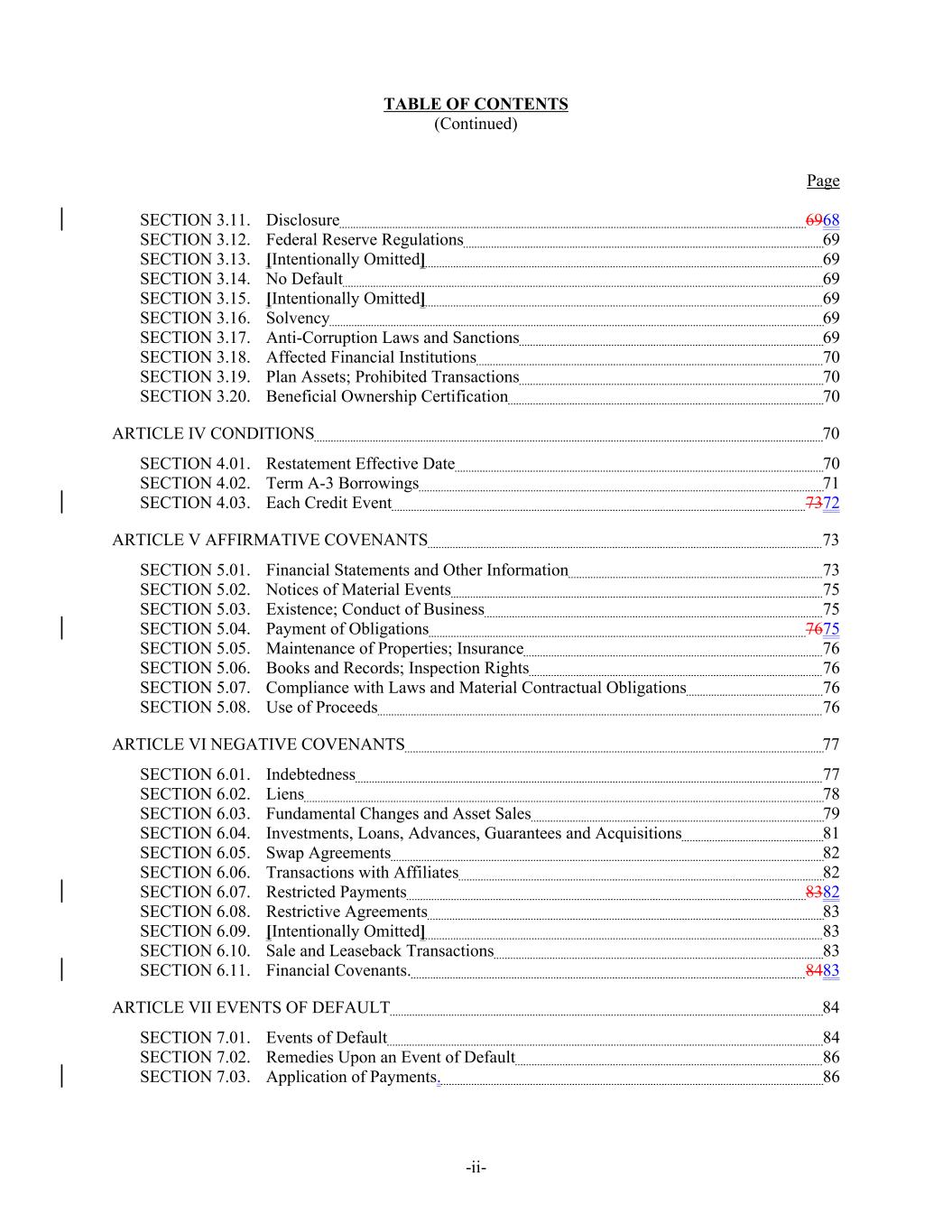 TABLE OF CONTENTS (Continued) Page SECTION 3.11. Disclosure 6968 SECTION 3.12. Federal Reserve Regulations 69 SECTION 3.13. [Intentionally Omitted] 69 SECTION 3.14. No Default 69 SECTION 3.15. [Intentionally Omitted] 69 SECTION 3.16. Solvency 69 SECTION 3.17. Anti-Corruption Laws and Sanctions 69 SECTION 3.18. Affected Financial Institutions 70 SECTION 3.19. Plan Assets; Prohibited Transactions 70 SECTION 3.20. Beneficial Ownership Certification 70 ARTICLE IV CONDITIONS 70 SECTION 4.01. Restatement Effective Date 70 SECTION 4.02. Term A-3 Borrowings 71 SECTION 4.03. Each Credit Event 7372 ARTICLE V AFFIRMATIVE COVENANTS 73 SECTION 5.01. Financial Statements and Other Information 73 SECTION 5.02. Notices of Material Events 75 SECTION 5.03. Existence; Conduct of Business 75 SECTION 5.04. Payment of Obligations 7675 SECTION 5.05. Maintenance of Properties; Insurance 76 SECTION 5.06. Books and Records; Inspection Rights 76 SECTION 5.07. Compliance with Laws and Material Contractual Obligations 76 SECTION 5.08. Use of Proceeds 76 ARTICLE VI NEGATIVE COVENANTS 77 SECTION 6.01. Indebtedness 77 SECTION 6.02. Liens 78 SECTION 6.03. Fundamental Changes and Asset Sales 79 SECTION 6.04. Investments, Loans, Advances, Guarantees and Acquisitions 81 SECTION 6.05. Swap Agreements 82 SECTION 6.06. Transactions with Affiliates 82 SECTION 6.07. Restricted Payments 8382 SECTION 6.08. Restrictive Agreements 83 SECTION 6.09. [Intentionally Omitted] 83 SECTION 6.10. Sale and Leaseback Transactions 83 SECTION 6.11. Financial Covenants. 8483 ARTICLE VII EVENTS OF DEFAULT 84 SECTION 7.01. Events of Default 84 SECTION 7.02. Remedies Upon an Event of Default 86 SECTION 7.03. Application of Payments. 86 -ii-