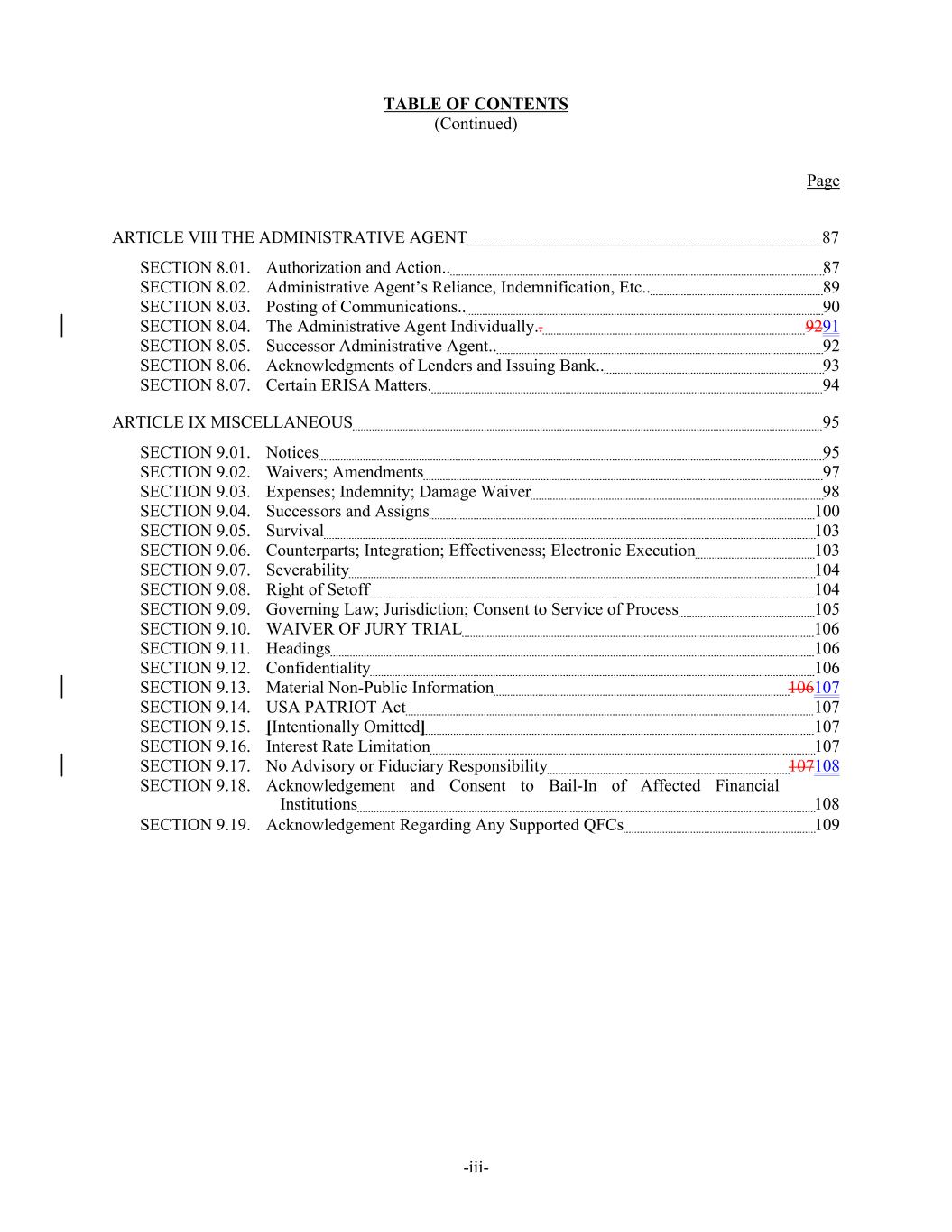 TABLE OF CONTENTS (Continued) Page ARTICLE VIII THE ADMINISTRATIVE AGENT 87 SECTION 8.01. Authorization and Action.. 87 SECTION 8.02. Administrative Agent’s Reliance, Indemnification, Etc.. 89 SECTION 8.03. Posting of Communications.. 90 SECTION 8.04. The Administrative Agent Individually.. 9291 SECTION 8.05. Successor Administrative Agent.. 92 SECTION 8.06. Acknowledgments of Lenders and Issuing Bank.. 93 SECTION 8.07. Certain ERISA Matters. 94 ARTICLE IX MISCELLANEOUS 95 SECTION 9.01. Notices 95 SECTION 9.02. Waivers; Amendments 97 SECTION 9.03. Expenses; Indemnity; Damage Waiver 98 SECTION 9.04. Successors and Assigns 100 SECTION 9.05. Survival 103 SECTION 9.06. Counterparts; Integration; Effectiveness; Electronic Execution 103 SECTION 9.07. Severability 104 SECTION 9.08. Right of Setoff 104 SECTION 9.09. Governing Law; Jurisdiction; Consent to Service of Process 105 SECTION 9.10. WAIVER OF JURY TRIAL 106 SECTION 9.11. Headings 106 SECTION 9.12. Confidentiality 106 SECTION 9.13. Material Non-Public Information 106107 SECTION 9.14. USA PATRIOT Act 107 SECTION 9.15. [Intentionally Omitted] 107 SECTION 9.16. Interest Rate Limitation 107 SECTION 9.17. No Advisory or Fiduciary Responsibility 107108 SECTION 9.18. Acknowledgement and Consent to Bail-In of Affected Financial Institutions 108 SECTION 9.19. Acknowledgement Regarding Any Supported QFCs 109 -iii-