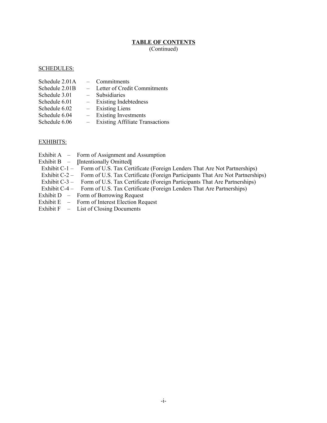 -i- Exhibit C-2 – Form of U.S. Tax Certificate (Foreign Participants That Are Not Partnerships) Exhibit C-3 – Form of U.S. Tax Certificate (Foreign Participants That Are Partnerships) Exhibit C-1 – Form of U.S. Tax Certificate (Foreign Lenders That Are Not Partnerships) Exhibit C-4 – Form of U.S. Tax Certificate (Foreign Lenders That Are Partnerships) Exhibit D – Form of Borrowing Request Exhibit E – Form of Interest Election Request Exhibit F – List of Closing Documents TABLE OF CONTENTS (Continued) SCHEDULES: Schedule 2.01A – Commitments Schedule 2.01B – Letter of Credit Commitments Schedule 3.01 – Subsidiaries Schedule 6.01 – Existing Indebtedness Schedule 6.02 – Existing Liens Schedule 6.04 – Existing Investments Schedule 6.06 – Existing Affiliate Transactions EXHIBITS: Exhibit A – Form of Assignment and Assumption Exhibit B – [Intentionally Omitted]
