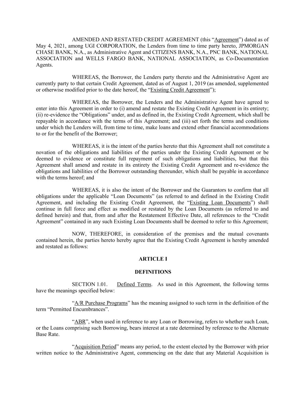 AMENDED AND RESTATED CREDIT AGREEMENT (this “Agreement”) dated as of May 4, 2021, among UGI CORPORATION, the Lenders from time to time party hereto, JPMORGAN CHASE BANK, N.A., as Administrative Agent and CITIZENS BANK, N.A., PNC BANK, NATIONAL ASSOCIATION and WELLS FARGO BANK, NATIONAL ASSOCIATION, as Co-Documentation Agents. WHEREAS, the Borrower, the Lenders party thereto and the Administrative Agent are currently party to that certain Credit Agreement, dated as of August 1, 2019 (as amended, supplemented or otherwise modified prior to the date hereof, the “Existing Credit Agreement”); WHEREAS, the Borrower, the Lenders and the Administrative Agent have agreed to enter into this Agreement in order to (i) amend and restate the Existing Credit Agreement in its entirety; (ii) re-evidence the “Obligations” under, and as defined in, the Existing Credit Agreement, which shall be repayable in accordance with the terms of this Agreement; and (iii) set forth the terms and conditions under which the Lenders will, from time to time, make loans and extend other financial accommodations to or for the benefit of the Borrower; WHEREAS, it is the intent of the parties hereto that this Agreement shall not constitute a novation of the obligations and liabilities of the parties under the Existing Credit Agreement or be deemed to evidence or constitute full repayment of such obligations and liabilities, but that this Agreement shall amend and restate in its entirety the Existing Credit Agreement and re-evidence the obligations and liabilities of the Borrower outstanding thereunder, which shall be payable in accordance with the terms hereof; and WHEREAS, it is also the intent of the Borrower and the Guarantors to confirm that all obligations under the applicable “Loan Documents” (as referred to and defined in the Existing Credit Agreement, and including the Existing Credit Agreement, the “Existing Loan Documents”) shall continue in full force and effect as modified or restated by the Loan Documents (as referred to and defined herein) and that, from and after the Restatement Effective Date, all references to the “Credit Agreement” contained in any such Existing Loan Documents shall be deemed to refer to this Agreement; NOW, THEREFORE, in consideration of the premises and the mutual covenants contained herein, the parties hereto hereby agree that the Existing Credit Agreement is hereby amended and restated as follows: ARTICLE I DEFINITIONS SECTION 1.01. Defined Terms. As used in this Agreement, the following terms have the meanings specified below: “A/R Purchase Programs” has the meaning assigned to such term in the definition of the term “Permitted Encumbrances”. “ABR”, when used in reference to any Loan or Borrowing, refers to whether such Loan, or the Loans comprising such Borrowing, bears interest at a rate determined by reference to the Alternate Base Rate. “Acquisition Period” means any period, to the extent elected by the Borrower with prior written notice to the Administrative Agent, commencing on the date that any Material Acquisition is