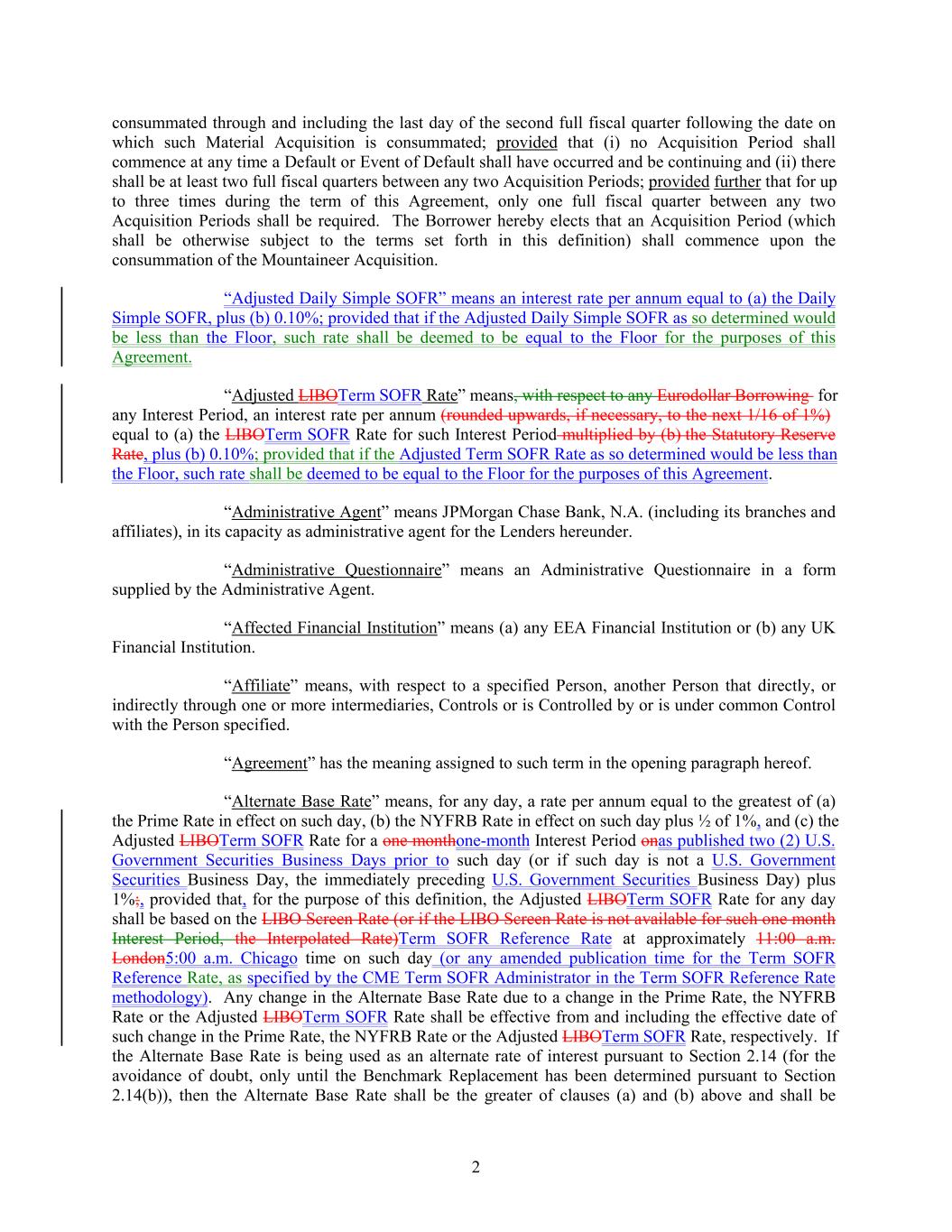 consummated through and including the last day of the second full fiscal quarter following the date on which such Material Acquisition is consummated; provided that (i) no Acquisition Period shall commence at any time a Default or Event of Default shall have occurred and be continuing and (ii) there shall be at least two full fiscal quarters between any two Acquisition Periods; provided further that for up to three times during the term of this Agreement, only one full fiscal quarter between any two Acquisition Periods shall be required. The Borrower hereby elects that an Acquisition Period (which shall be otherwise subject to the terms set forth in this definition) shall commence upon the consummation of the Mountaineer Acquisition. “Adjusted Daily Simple SOFR” means an interest rate per annum equal to (a) the Daily Simple SOFR, plus (b) 0.10%; provided that if the Adjusted Daily Simple SOFR as so determined would be less than the Floor, such rate shall be deemed to be equal to the Floor for the purposes of this Agreement. “Adjusted LIBOTerm SOFR Rate” means, with respect to any Eurodollar Borrowing for any Interest Period, an interest rate per annum (rounded upwards, if necessary, to the next 1/16 of 1%) equal to (a) the LIBOTerm SOFR Rate for such Interest Period multiplied by (b) the Statutory Reserve Rate, plus (b) 0.10%; provided that if the Adjusted Term SOFR Rate as so determined would be less than the Floor, such rate shall be deemed to be equal to the Floor for the purposes of this Agreement. “Administrative Agent” means JPMorgan Chase Bank, N.A. (including its branches and affiliates), in its capacity as administrative agent for the Lenders hereunder. “Administrative Questionnaire” means an Administrative Questionnaire in a form supplied by the Administrative Agent. “Affected Financial Institution” means (a) any EEA Financial Institution or (b) any UK Financial Institution. “Affiliate” means, with respect to a specified Person, another Person that directly, or indirectly through one or more intermediaries, Controls or is Controlled by or is under common Control with the Person specified. “Agreement” has the meaning assigned to such term in the opening paragraph hereof. “Alternate Base Rate” means, for any day, a rate per annum equal to the greatest of (a) the Prime Rate in effect on such day, (b) the NYFRB Rate in effect on such day plus ½ of 1%, and (c) the Adjusted LIBOTerm SOFR Rate for a one monthone-month Interest Period onas published two (2) U.S. Government Securities Business Days prior to such day (or if such day is not a U.S. Government Securities Business Day, the immediately preceding U.S. Government Securities Business Day) plus 1%;, provided that, for the purpose of this definition, the Adjusted LIBOTerm SOFR Rate for any day shall be based on the LIBO Screen Rate (or if the LIBO Screen Rate is not available for such one month Interest Period, the Interpolated Rate)Term SOFR Reference Rate at approximately 11:00 a.m. London5:00 a.m. Chicago time on such day (or any amended publication time for the Term SOFR Reference Rate, as specified by the CME Term SOFR Administrator in the Term SOFR Reference Rate methodology). Any change in the Alternate Base Rate due to a change in the Prime Rate, the NYFRB Rate or the Adjusted LIBOTerm SOFR Rate shall be effective from and including the effective date of such change in the Prime Rate, the NYFRB Rate or the Adjusted LIBOTerm SOFR Rate, respectively. If the Alternate Base Rate is being used as an alternate rate of interest pursuant to Section 2.14 (for the avoidance of doubt, only until the Benchmark Replacement has been determined pursuant to Section 2.14(b)), then the Alternate Base Rate shall be the greater of clauses (a) and (b) above and shall be 2