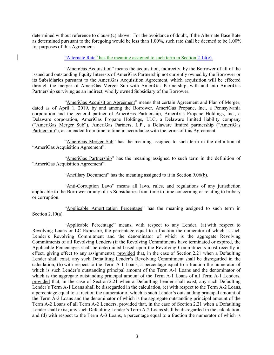 determined without reference to clause (c) above. For the avoidance of doubt, if the Alternate Base Rate as determined pursuant to the foregoing would be less than 1.00%, such rate shall be deemed to be 1.00% for purposes of this Agreement. “Alternate Rate” has the meaning assigned to such term in Section 2.14(c). “AmeriGas Acquisition” means the acquisition, indirectly, by the Borrower of all of the issued and outstanding Equity Interests of AmeriGas Partnership not currently owned by the Borrower or its Subsidiaries pursuant to the AmeriGas Acquisition Agreement, which acquisition will be effected through the merger of AmeriGas Merger Sub with AmeriGas Partnership, with and into AmeriGas Partnership surviving as an indirect, wholly owned Subsidiary of the Borrower. “AmeriGas Acquisition Agreement” means that certain Agreement and Plan of Merger, dated as of April 1, 2019, by and among the Borrower, AmeriGas Propane, Inc., a Pennsylvania corporation and the general partner of AmeriGas Partnership, AmeriGas Propane Holdings, Inc., a Delaware corporation, AmeriGas Propane Holdings, LLC, a Delaware limited liability company (“AmeriGas Merger Sub”), AmeriGas Partners, L.P., a Delaware limited partnership (“AmeriGas Partnership”), as amended from time to time in accordance with the terms of this Agreement. “AmeriGas Merger Sub” has the meaning assigned to such term in the definition of “AmeriGas Acquisition Agreement”. “AmeriGas Partnership” has the meaning assigned to such term in the definition of “AmeriGas Acquisition Agreement”. “Ancillary Document” has the meaning assigned to it in Section 9.06(b). “Anti-Corruption Laws” means all laws, rules, and regulations of any jurisdiction applicable to the Borrower or any of its Subsidiaries from time to time concerning or relating to bribery or corruption. “Applicable Amortization Percentage” has the meaning assigned to such term in Section 2.10(a). “Applicable Percentage” means, with respect to any Lender, (a) with respect to Revolving Loans or LC Exposure, the percentage equal to a fraction the numerator of which is such Lender’s Revolving Commitment and the denominator of which is the aggregate Revolving Commitments of all Revolving Lenders (if the Revolving Commitments have terminated or expired, the Applicable Percentages shall be determined based upon the Revolving Commitments most recently in effect, giving effect to any assignments); provided that, in the case of Section 2.21 when a Defaulting Lender shall exist, any such Defaulting Lender’s Revolving Commitment shall be disregarded in the calculation, (b) with respect to the Term A-1 Loans, a percentage equal to a fraction the numerator of which is such Lender’s outstanding principal amount of the Term A-1 Loans and the denominator of which is the aggregate outstanding principal amount of the Term A-1 Loans of all Term A-1 Lenders, provided that, in the case of Section 2.21 when a Defaulting Lender shall exist, any such Defaulting Lender’s Term A-1 Loans shall be disregarded in the calculation, (c) with respect to the Term A-2 Loans, a percentage equal to a fraction the numerator of which is such Lender’s outstanding principal amount of the Term A-2 Loans and the denominator of which is the aggregate outstanding principal amount of the Term A-2 Loans of all Term A-2 Lenders, provided that, in the case of Section 2.21 when a Defaulting Lender shall exist, any such Defaulting Lender’s Term A-2 Loans shall be disregarded in the calculation, and (d) with respect to the Term A-3 Loans, a percentage equal to a fraction the numerator of which is 3