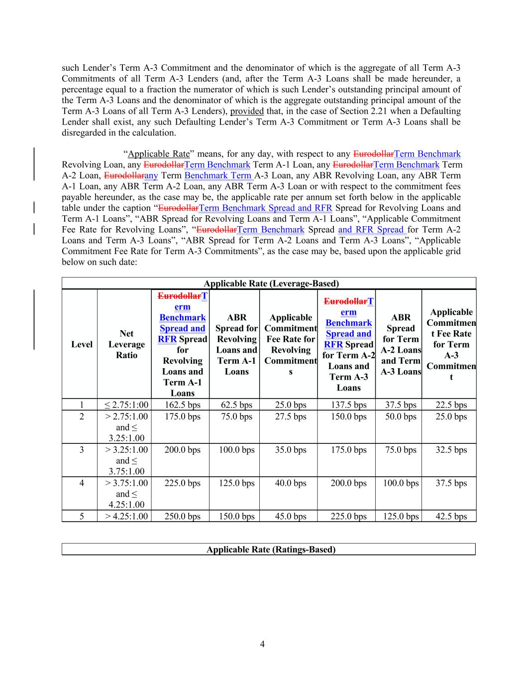 4 25.0 bps ≤ 2.75:1:00 3 EurodollarT erm Benchmark Spread and RFR Spread for Revolving Loans and Term A-1 Loans > 3.25:1.00 and ≤ 3.75:1.00 162.5 bps 200.0 bps Applicable Rate (Leverage-Based) 100.0 bps 62.5 bps 35.0 bps ABR Spread for Revolving Loans and Term A-1 Loans 175.0 bps 25.0 bps 75.0 bps 32.5 bps 137.5 bps Applicable Commitment Fee Rate for Revolving Commitment s 4 37.5 bps > 3.75:1.00 and ≤ 4.25:1.00 225.0 bps 22.5 bps 125.0 bps EurodollarT erm Benchmark Spread and RFR Spread for Term A-2 Loans and Term A-3 Loans 40.0 bps 200.0 bps such Lender’s Term A-3 Commitment and the denominator of which is the aggregate of all Term A-3 Commitments of all Term A-3 Lenders (and, after the Term A-3 Loans shall be made hereunder, a percentage equal to a fraction the numerator of which is such Lender’s outstanding principal amount of the Term A-3 Loans and the denominator of which is the aggregate outstanding principal amount of the Term A-3 Loans of all Term A-3 Lenders), provided that, in the case of Section 2.21 when a Defaulting Lender shall exist, any such Defaulting Lender’s Term A-3 Commitment or Term A-3 Loans shall be disregarded in the calculation. “Applicable Rate” means, for any day, with respect to any EurodollarTerm Benchmark Revolving Loan, any EurodollarTerm Benchmark Term A-1 Loan, any EurodollarTerm Benchmark Term A-2 Loan, Eurodollarany Term Benchmark Term A-3 Loan, any ABR Revolving Loan, any ABR Term A-1 Loan, any ABR Term A-2 Loan, any ABR Term A-3 Loan or with respect to the commitment fees payable hereunder, as the case may be, the applicable rate per annum set forth below in the applicable table under the caption “EurodollarTerm Benchmark Spread and RFR Spread for Revolving Loans and Term A-1 Loans”, “ABR Spread for Revolving Loans and Term A-1 Loans”, “Applicable Commitment Fee Rate for Revolving Loans”, “EurodollarTerm Benchmark Spread and RFR Spread for Term A-2 Loans and Term A-3 Loans”, “ABR Spread for Term A-2 Loans and Term A-3 Loans”, “Applicable Commitment Fee Rate for Term A-3 Commitments”, as the case may be, based upon the applicable grid below on such date: 100.0 bps 2 37.5 bps ABR Spread for Term A-2 Loans and Term A-3 Loans > 2.75:1.00 and ≤ 3.25:1.00 5 Level > 4.25:1.00 175.0 bps 250.0 bps Applicable Commitmen t Fee Rate for Term A-3 Commitmen t 150.0 bps 75.0 bps 45.0 bps 225.0 bps 27.5 bps 125.0 bps 42.5 bps 150.0 bps Net Leverage Ratio Applicable Rate (Ratings-Based) 50.0 bps 1
