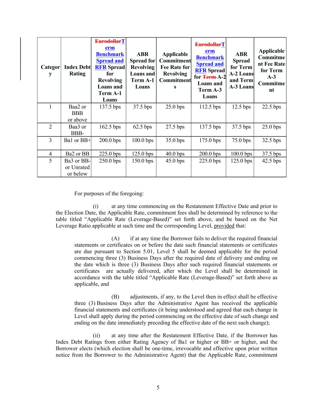 5 137.5 bps Applicable Commitment Fee Rate for Revolving Commitment s 3 37.5 bps Ba1 or BB+ 200.0 bps 25.0 bps 100.0 bps EurodollarT erm Benchmark Spread and RFR Spread for Term A-2 Loans and Term A-3 Loans 35.0 bps 112.5 bps 175.0 bps Index Debt Rating 75.0 bps 12.5 bps 32.5 bps ABR Spread for Term A-2 Loans and Term A-3 Loans 22.5 bps 4 Ba2 or BB 225.0 bps Applicable Commitme nt Fee Rate for Term A-3 Commitme nt 125.0 bps 2 40.0 bps EurodollarT erm Benchmark Spread and RFR Spread for Revolving Loans and Term A-1 Loans 200.0 bps Baa3 or BBB- 100.0 bps 37.5 bps 162.5 bps 5 62.5 bps Ba3 or BB- or Unrated or below 1 250.0 bps 27.5 bps 150.0 bps ABR Spread for Revolving Loans and Term A-1 Loans 45.0 bps 137.5 bps 225.0 bps Baa2 or BBB or above 125.0 bps 37.5 bps 42.5 bps Categor y For purposes of the foregoing: (i) at any time commencing on the Restatement Effective Date and prior to the Election Date, the Applicable Rate, commitment fees shall be determined by reference to the table titled “Applicable Rate (Leverage-Based)” set forth above, and be based on the Net Leverage Ratio applicable at such time and the corresponding Level, provided that: (A) if at any time the Borrower fails to deliver the required financial statements or certificates on or before the date such financial statements or certificates are due pursuant to Section 5.01, Level 5 shall be deemed applicable for the period commencing three (3) Business Days after the required date of delivery and ending on the date which is three (3) Business Days after such required financial statements or certificates are actually delivered, after which the Level shall be determined in accordance with the table titled “Applicable Rate (Leverage-Based)” set forth above as applicable, and (B) adjustments, if any, to the Level then in effect shall be effective three (3) Business Days after the Administrative Agent has received the applicable financial statements and certificates (it being understood and agreed that each change in Level shall apply during the period commencing on the effective date of such change and ending on the date immediately preceding the effective date of the next such change); (ii) at any time after the Restatement Effective Date, if the Borrower has Index Debt Ratings from either Rating Agency of Ba1 or higher or BB+ or higher, and the Borrower elects (which election shall be one-time, irrevocable and effective upon prior written notice from the Borrower to the Administrative Agent) that the Applicable Rate, commitment 25.0 bps