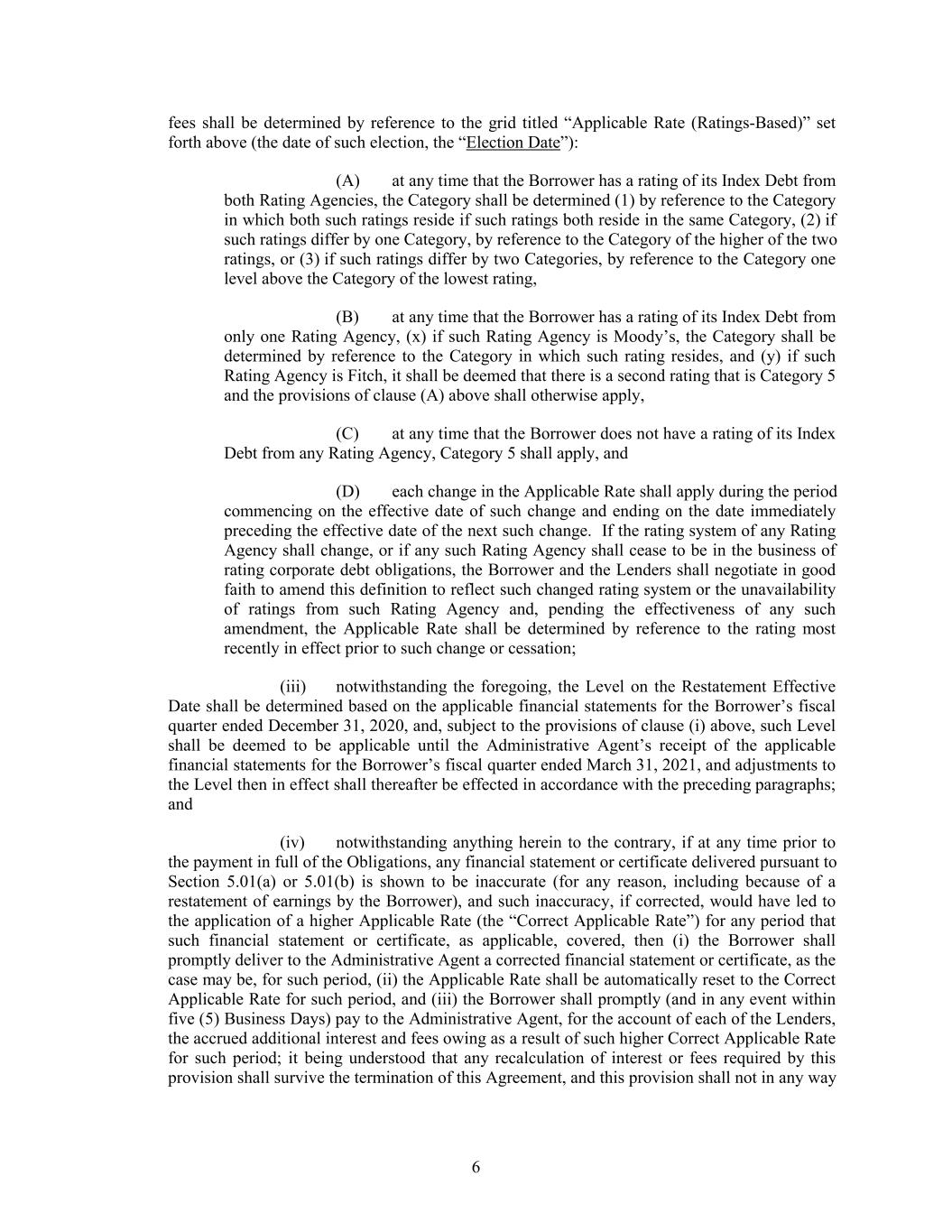 fees shall be determined by reference to the grid titled “Applicable Rate (Ratings-Based)” set forth above (the date of such election, the “Election Date”): (A) at any time that the Borrower has a rating of its Index Debt from both Rating Agencies, the Category shall be determined (1) by reference to the Category in which both such ratings reside if such ratings both reside in the same Category, (2) if such ratings differ by one Category, by reference to the Category of the higher of the two ratings, or (3) if such ratings differ by two Categories, by reference to the Category one level above the Category of the lowest rating, (B) at any time that the Borrower has a rating of its Index Debt from only one Rating Agency, (x) if such Rating Agency is Moody’s, the Category shall be determined by reference to the Category in which such rating resides, and (y) if such Rating Agency is Fitch, it shall be deemed that there is a second rating that is Category 5 and the provisions of clause (A) above shall otherwise apply, (C) at any time that the Borrower does not have a rating of its Index Debt from any Rating Agency, Category 5 shall apply, and (D) each change in the Applicable Rate shall apply during the period commencing on the effective date of such change and ending on the date immediately preceding the effective date of the next such change. If the rating system of any Rating Agency shall change, or if any such Rating Agency shall cease to be in the business of rating corporate debt obligations, the Borrower and the Lenders shall negotiate in good faith to amend this definition to reflect such changed rating system or the unavailability of ratings from such Rating Agency and, pending the effectiveness of any such amendment, the Applicable Rate shall be determined by reference to the rating most recently in effect prior to such change or cessation; (iii) notwithstanding the foregoing, the Level on the Restatement Effective Date shall be determined based on the applicable financial statements for the Borrower’s fiscal quarter ended December 31, 2020, and, subject to the provisions of clause (i) above, such Level shall be deemed to be applicable until the Administrative Agent’s receipt of the applicable financial statements for the Borrower’s fiscal quarter ended March 31, 2021, and adjustments to the Level then in effect shall thereafter be effected in accordance with the preceding paragraphs; and (iv) notwithstanding anything herein to the contrary, if at any time prior to the payment in full of the Obligations, any financial statement or certificate delivered pursuant to Section 5.01(a) or 5.01(b) is shown to be inaccurate (for any reason, including because of a restatement of earnings by the Borrower), and such inaccuracy, if corrected, would have led to the application of a higher Applicable Rate (the “Correct Applicable Rate”) for any period that such financial statement or certificate, as applicable, covered, then (i) the Borrower shall promptly deliver to the Administrative Agent a corrected financial statement or certificate, as the case may be, for such period, (ii) the Applicable Rate shall be automatically reset to the Correct Applicable Rate for such period, and (iii) the Borrower shall promptly (and in any event within five (5) Business Days) pay to the Administrative Agent, for the account of each of the Lenders, the accrued additional interest and fees owing as a result of such higher Correct Applicable Rate for such period; it being understood that any recalculation of interest or fees required by this provision shall survive the termination of this Agreement, and this provision shall not in any way 6